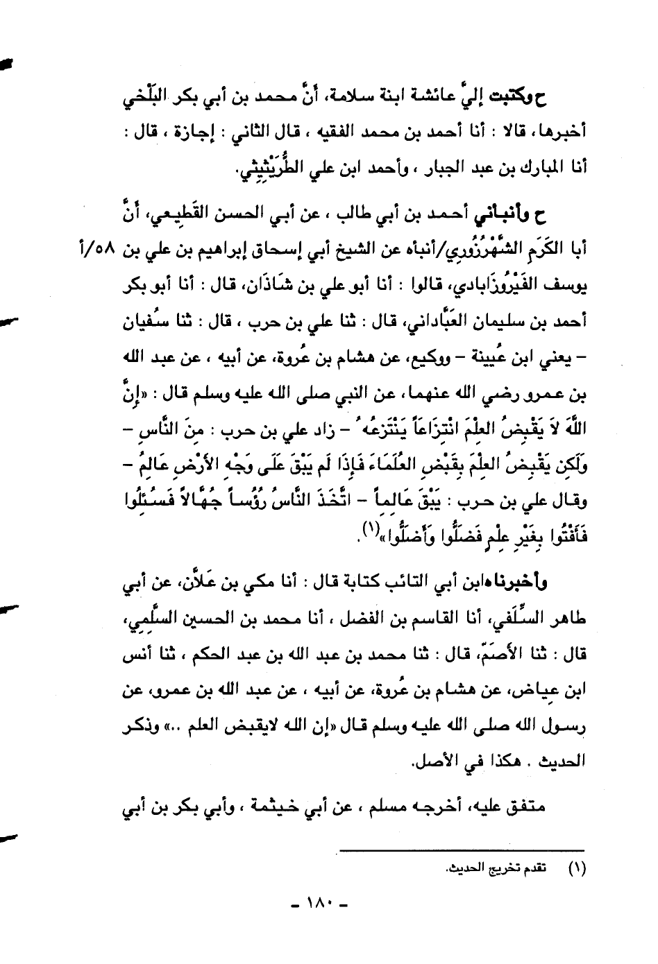 ح وأنبأني أحمد بن أبي طالب، عن أبي الحسن القطيعي، أن أبا الكرم الشهرزوري أنبأه عن الشيخ أبي إسحاق إبراهيم بن علي بن يوسف الفيروزابادي، قالوا: أنا أبو علي بن شاذان، قال: أنا أبو بكر أحمد بن سليمان العباداني، قال: ثنا علي بن حرب، قال: ثنا سفيان -يعني ابن عيينة- ووكيع، عن هشام بن عروة، عن أبيه، عن عبد الله بن عمرو رضي الله عنهما، عن النبي صلى الله عليه وسلم قال: ((إن الله لا يقبض العلم انتزاعاً ينتزعه -زاد علي بن حرب: من الناس- ولكن يقبض العلم بقبض العلماء فإذا لم يبق على وجه الأرض عالم -وقال علي بن حرب: يبق عالماً- اتخذ الناس رؤساً جهالاً فسئلوا فأفتوا بغير علمٍ فضلوا وأضلوا)) .
