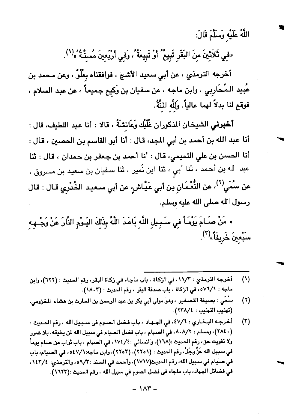 أخبرني الشيخان المذكوران غلبك وعائشة، قالا: أنا عبد اللطيف، قال: أنا عبد الله بن أحمد بن أبي المجد، قال: أنا أبو القاسم بن الحصين، قال: أنا الحسن بن علي التميمي، قال: أنا أحمد بن جعفر بن حمدان، قال: ثنا عبد الله بن أحمد، ثنا أبي، ثنا ابن نمير، ثنا سفيان بن سعيد بن مسروق، عن سمي، عن النعمان بن أبي عياشٍ، عن أبي سعيد الخدري قال: قال رسول الله صلى الله عليه وسلم.