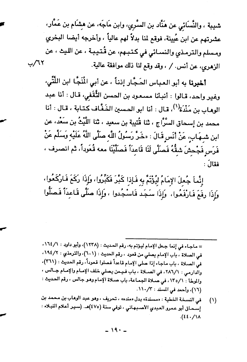 أخبرنا به أبو العباس الحجار إذناً، عن أبي المنجا ابن اللتي، وغير واحد، قالوا: أنبأنا مسعود بن الحسن الثقفي، قال: أنا عبد الوهاب بن مندة، قال: أنا أبو الحسين الخفاف كتابة، قال: أنا محمد بن إسحاق السراج، ثنا قتيبة بن سعيد، ثنا الليث بن سعد، عن ابن شهابٍ، عن أنسٍ قال: ((خر رسول الله صلى الله عليه وسلم عن فرسٍ فجحش شقه فصلى لنا قاعداً فصلينا معه قعوداً، ثم انصرف، فقال: