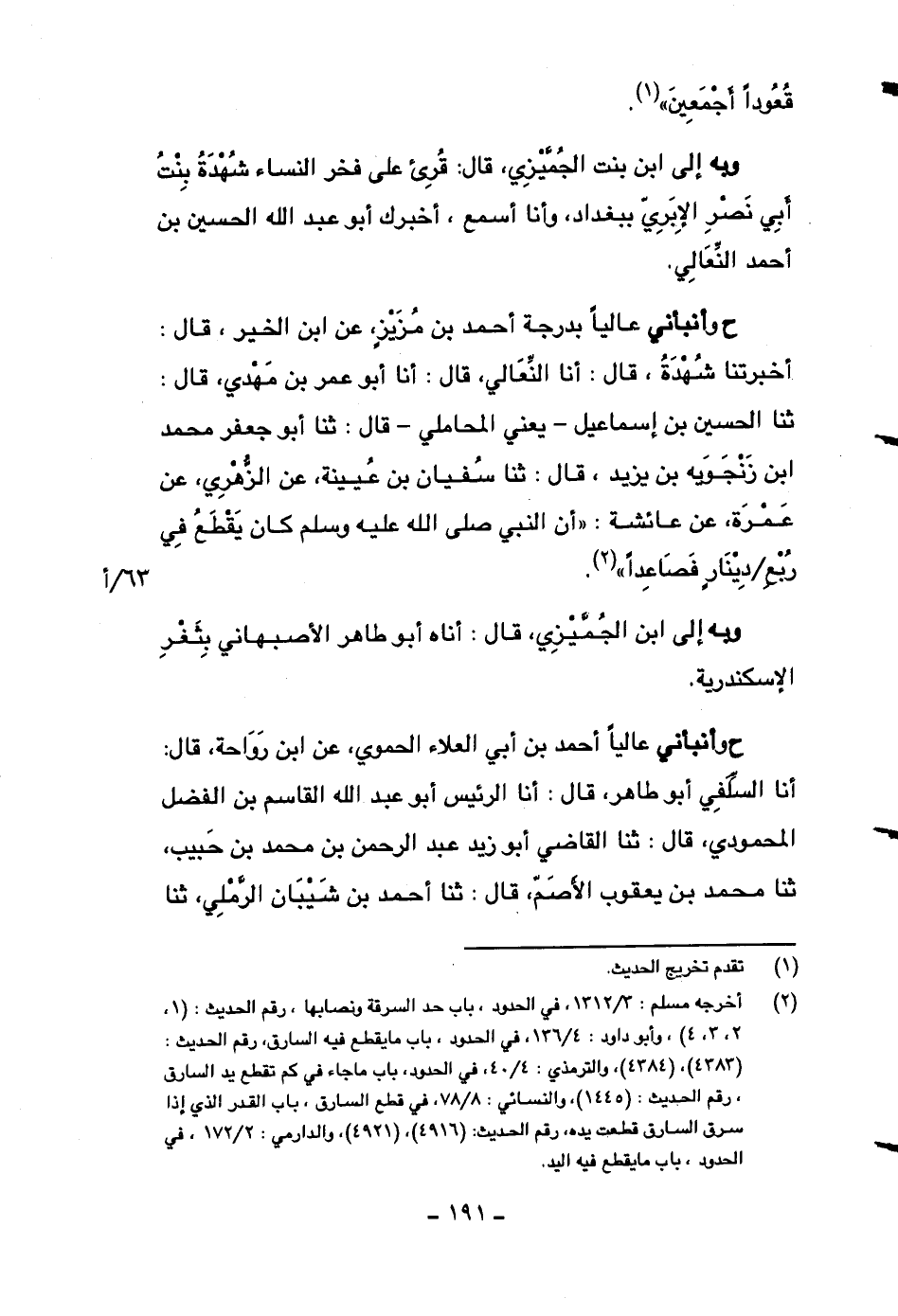 ح وأنبأني عالياً بدرجة أحمد بن مزيزٍ، عن ابن الخير، قال: أخبرتنا شهدة، قال: أنا النعالي، قال: أنا أبو عمر بن مهدي، قال: ثنا الحسين بن إسماعيل -يعني المحاملي- قال: ثنا أبو جعفر محمد ابن زنجويه بن يزيد، قال: ثنا سفيان بن عيينة، عن الزهري، عن عمرة، عن عائشة: ((أن النبي صلى الله عليه وسلم كان يقطع في ربع دينارٍ فصاعداً)) .