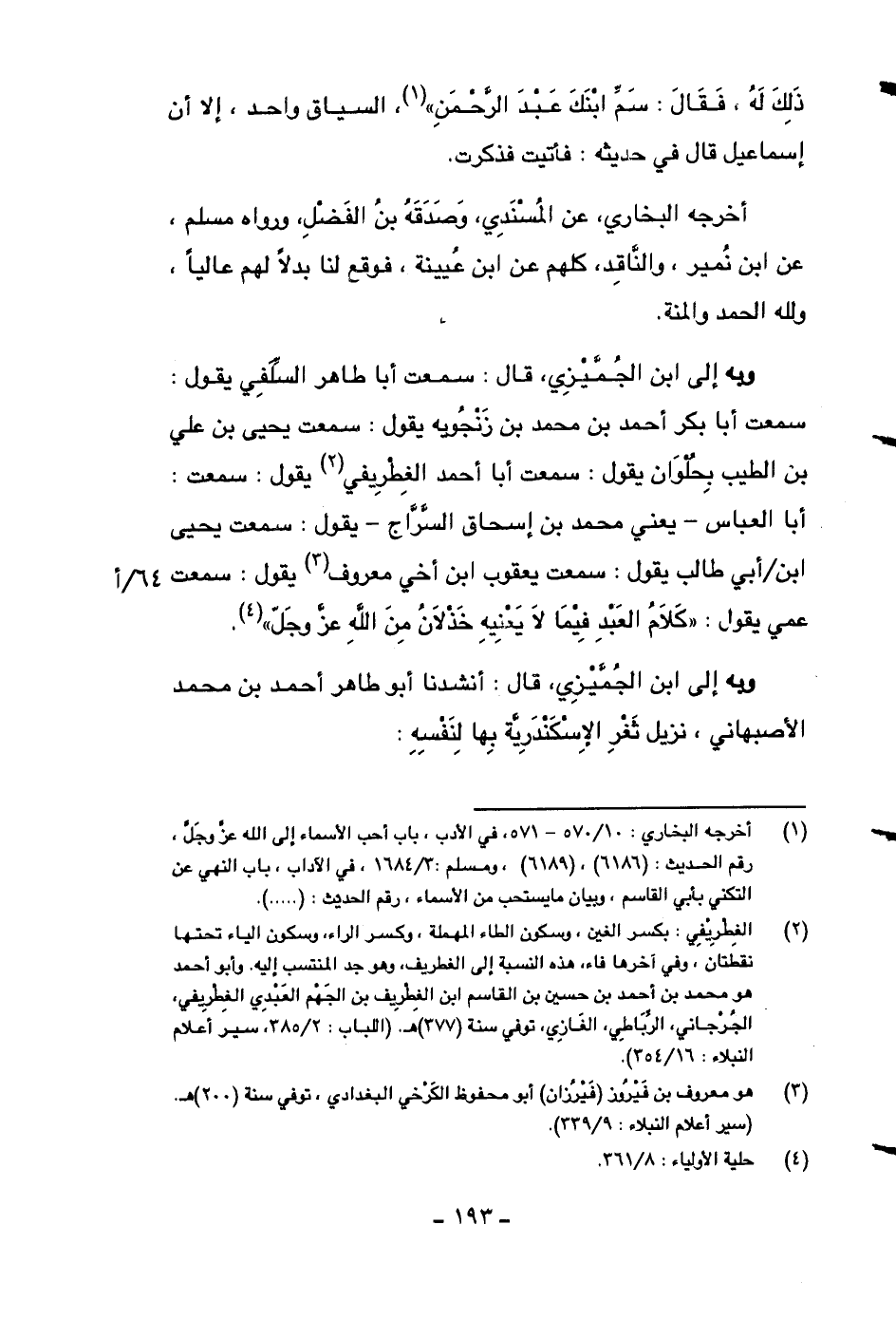 وبه إلى ابن الجميزي، قال: سمعت أبا طاهر السلفي يقول: سمعت أبا بكر أحمد بن محمد بن زنجويه يقول: سمعت يحيى بن علي بن الطيب بحلوان يقول: سمعت أبا أحمد الغطريفي يقول: سمعت أبا العباس -يعني محمد بن إسحاق السراج- يقول: سمعت يحيى ابن أبي طالب يقول: سمعت يعقوب ابن أخي معروف يقول: سمعت عمي يقول: ((كلام العبد فيما لا يعنيه خذلان من الله عز وجل)) .