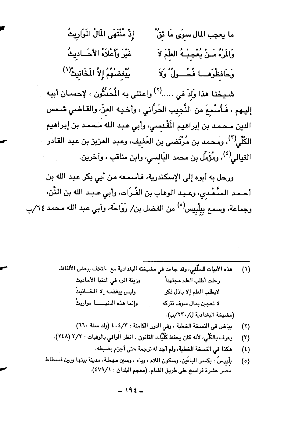 شيخنا هذا ولد في.. .. واعتنى به المحدثون، لإحسان أبيه إليهم، فأسمع من النجيب الحراني، وأخيه العز، والقاضي شمس الدين محمد بن إبراهيم المقدسي، وأبي عبد الله محمد بن إبراهيم الكلي، ومحمد بن مرتضى بن العفيف، وعبد العزيز بن عبد القادر الغيالي، ومؤمل بن محمد البالسي، وابن مناقب، وآخرين.
