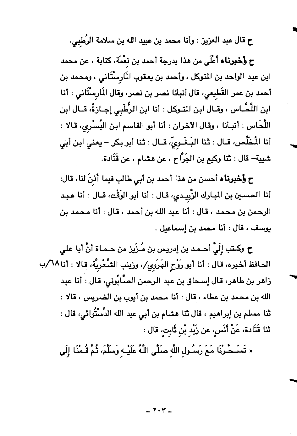 ح وكتب إلي أحمد بن إدريس بن مزيز من حماة أن أبا علي الحافظ أخبره، قال: أنا أبو روحٍ الهروي، وزينب الشعرية، قالا: أنا زاهر بن طاهر، قال إسحاق بن عبد الرحمن الصابوني، قال: أنا عبد الله بن محمد بن عطاء، قال: أنا محمد بن أيوب بن الضريس، قالا: ثنا مسلم بن إبراهيم، قال ثنا هشام بن أبي عبد الله الدستوائي، قال: ثنا قتادة، عن أنسٍ، عن زيد بن ثابتٍ، قال: