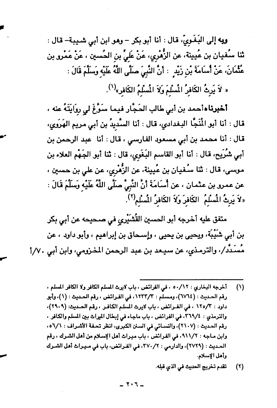 أخبرناه أحمد بن أبي طالب الحجار فيما سوغ لي روايته عنه، قال: أنا أبو المنجا البغدادي، قال: أنا السديد بن أبي مريم الهروي، قال: أنا محمد بن أبي مسعود الفارسي، قال: أنا عبد الرحمن بن أبي شريح، قال: أنا أبو القاسم البغوي، قال: ثنا أبو الجهم العلاء بن موسى، قال: ثنا سفيان بن عيينة، عن الزهري، عن علي بن حسين، عن عمرو بن عثمان، عن أسامة أن النبي صلى الله عليه وسلم قال: ((لا يرث المسلم الكافر ولا الكافر المسلم)) .