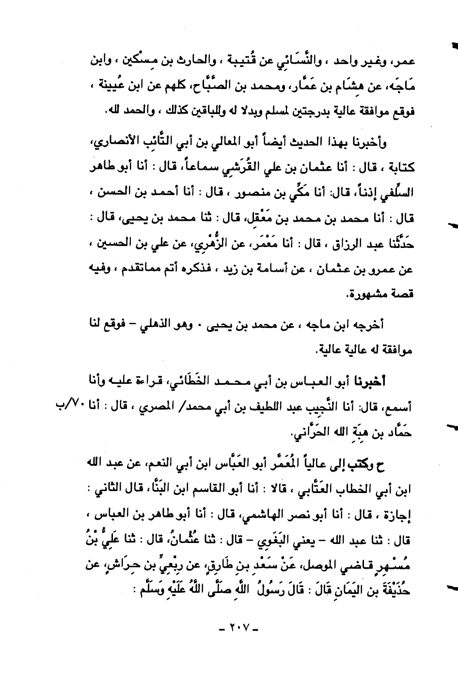 عمر، وغير واحد، والنسائي عن قتيبة، والحارث بن مسكين، وابن ماجه، عن هشام بن عمار، ومحمد بن الصباح، كلهم عن ابن عيينة، فوقع موافقة عالية بدرجتين لمسلم وبدلاً له وللباقين كذلك، والحمد لله.