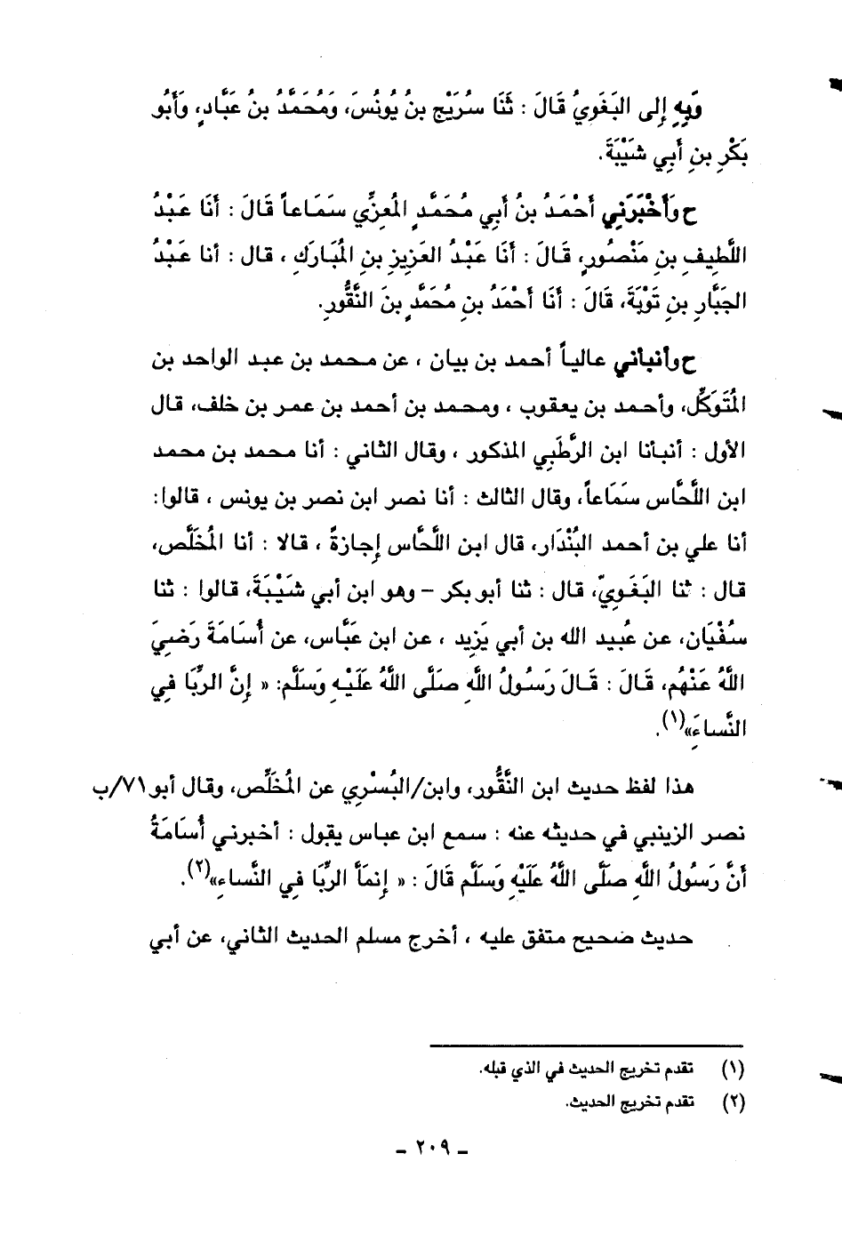 ح وأنبأني عالياً أحمد بن بيان، عن محمد بن عبد الواحد بن المتوكل، وأحمد بن يعقوب، ومحمد بن أحمد بن عمر بن خلف، قال الأول: أنبأنا ابن الرطبي المذكور، وقال الثاني: أنا محمد بن محمد ابن اللحاس سماعاً، وقال الثالث: أنا نصر ابن نصر بن يونس، قالوا: أنا علي بن أحمد البندار، قال ابن اللحاس إجازةً، قالا: أنا المخلص، قال: ثنا البغوي، قال: ثنا أبو بكر -وهو ابن أبي شيبة، قالوا: ثنا سفيان، عن عبيد الله بن أبي يزيد، عن ابن عباس، عن أسامة رضي الله عنهم، قال: قال رسول الله صلى الله عليه وسلم: ((إن الربا في النساء)) .