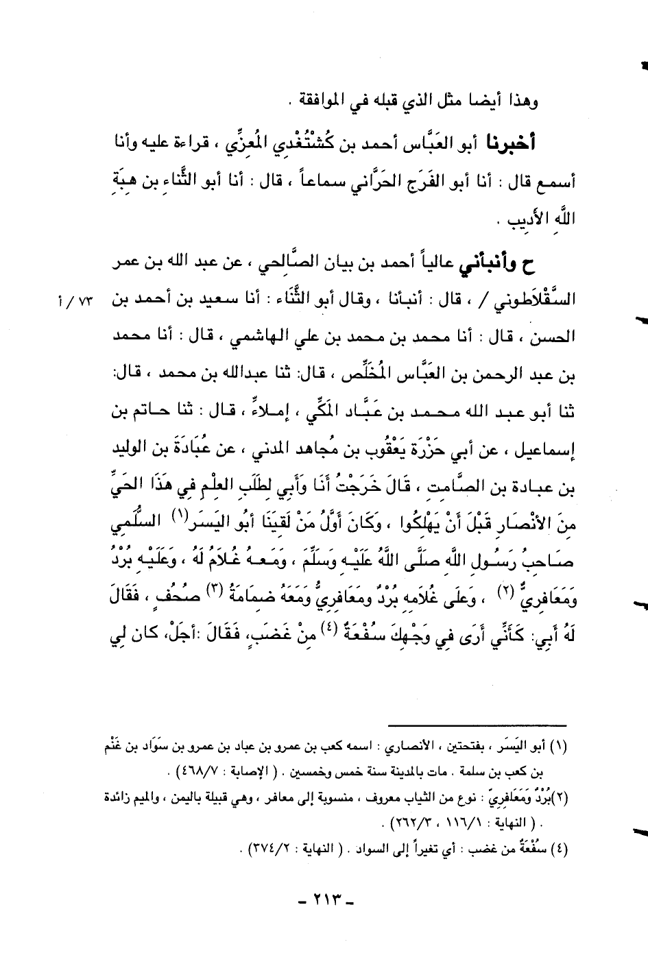 ح وأنبأني عالياً أحمد بن بيان الصالحي، عن عبد الله بن عمر السقلاطوني، قال: أنبأنا، وقال أبو الثناء: أنا سعيد بن أحمد بن الحسن، قال: أنا محمد بن محمد بن علي الهاشمي، قال: أنا محمد بن عبد الرحمن بن العباس المخلص، قال: ثنا عبد الله بن محمد، قال: ثنا أبو عبد الله محمد بن عباد المكي، إملاءً، قال: ثنا حاتم بن إسماعيل، عن أبي حزرة يعقوب بن مجاهد المدني، عن عبادة بن الوليد بن عبادة بن الصامت، قال خرجت أنا وأبي لطلب العلم في هذا الحي من الأنصار قبل أن يهلكوا، وكان أول من لقينا أبو اليسر السلمي صاحب رسول الله صلى الله عليه وسلم، ومعه غلام له، وعليه برد ومعافري، وعلى غلامه بردٌ ومعافري ومعه ضمامة صحفٍ، فقال له أبي: كأني أرى في وجهك سفعةٌ من غضبٍ، فقال: أجل، كان لي