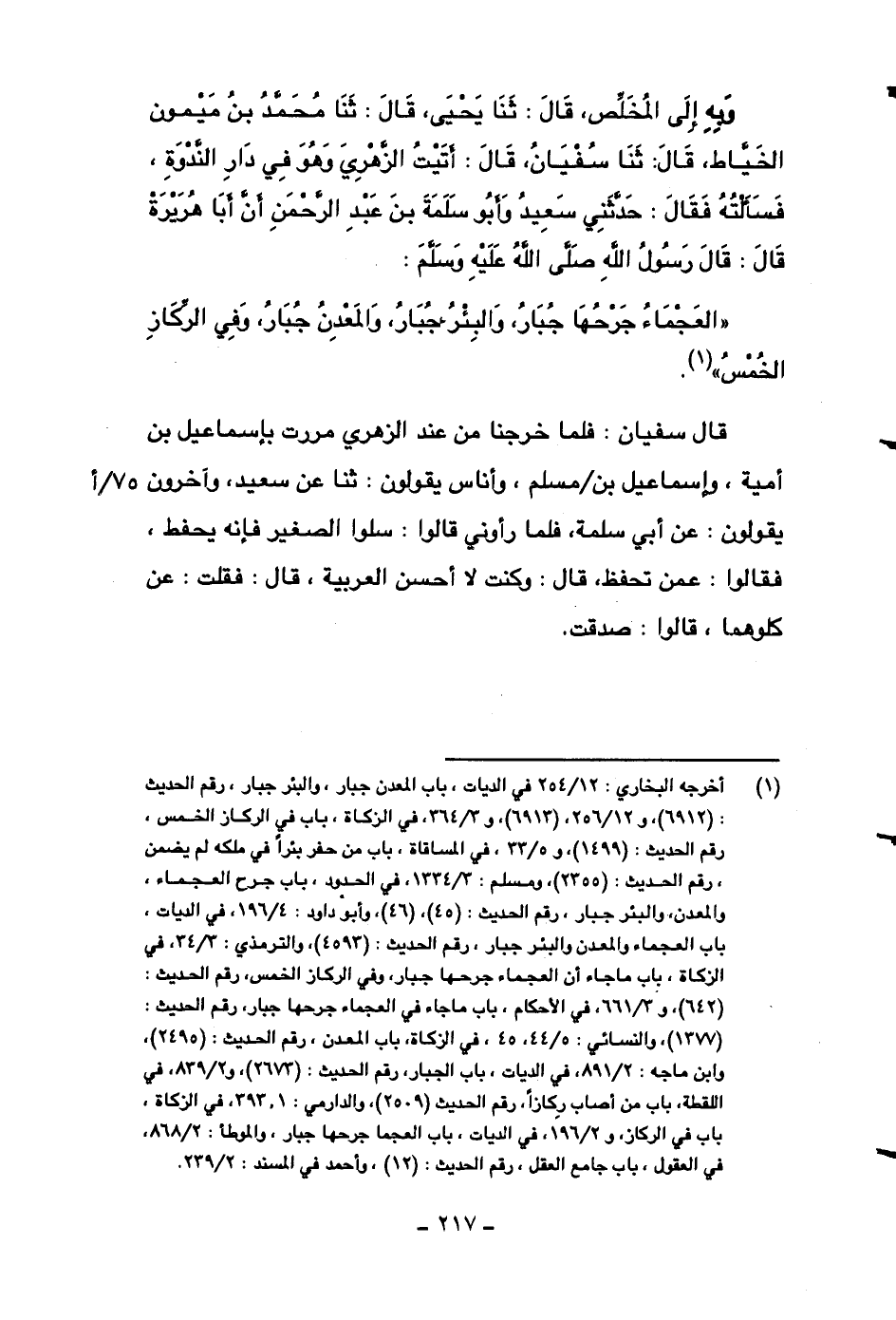 ((العجماء جرحها جبار، والبئر جبار، والمعدن جبار، وفي الركاز الخمس)) .