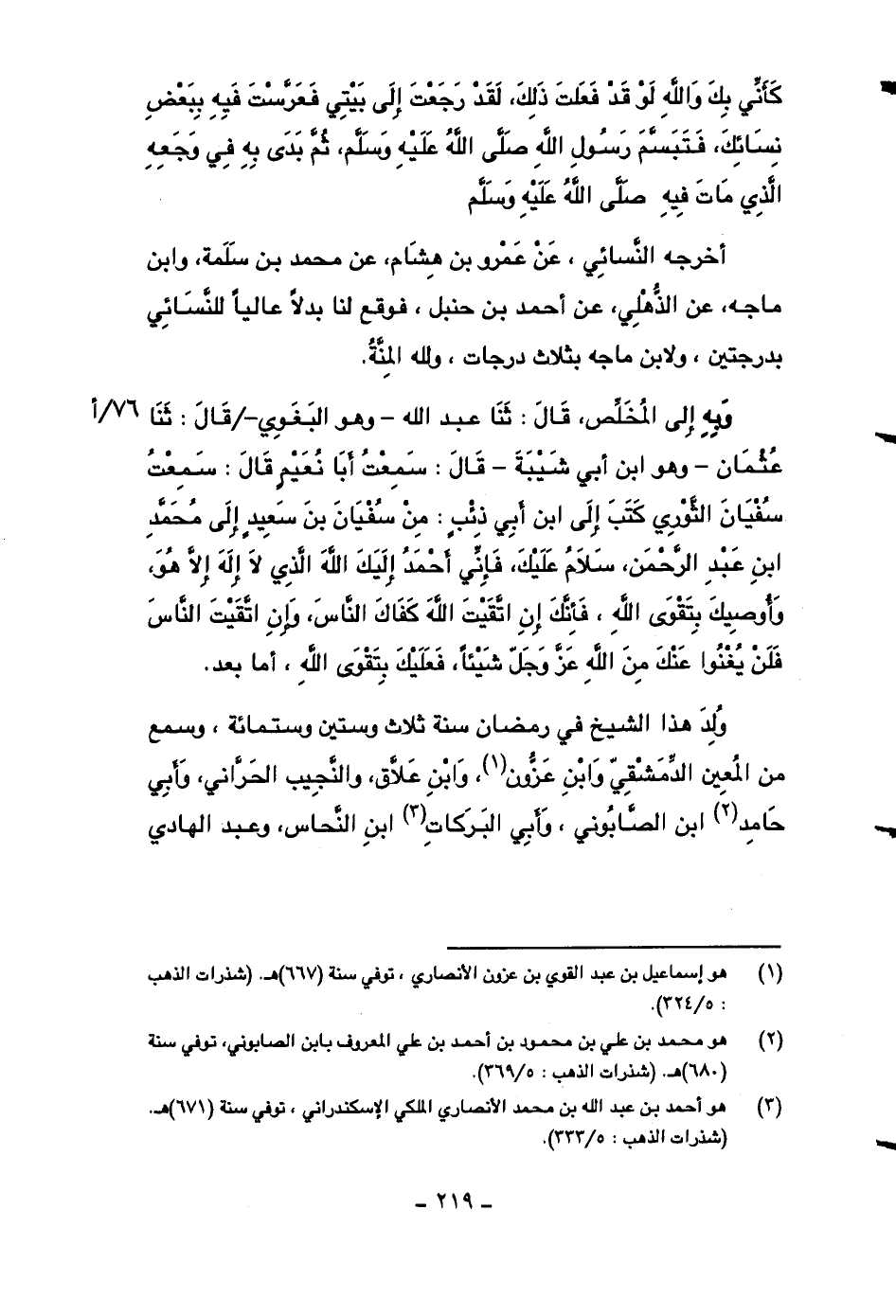 أخرجه النسائي، عن عمرو بن هشام، عن محمد بن سلمة، وابن ماجه، عن الذهلي، عن أحمد بن حنبل، فوقع لنا بدلاً عالياً للنسائي بدرجتين، ولابن ماجه بثلاث درجات، ولله المنة.
