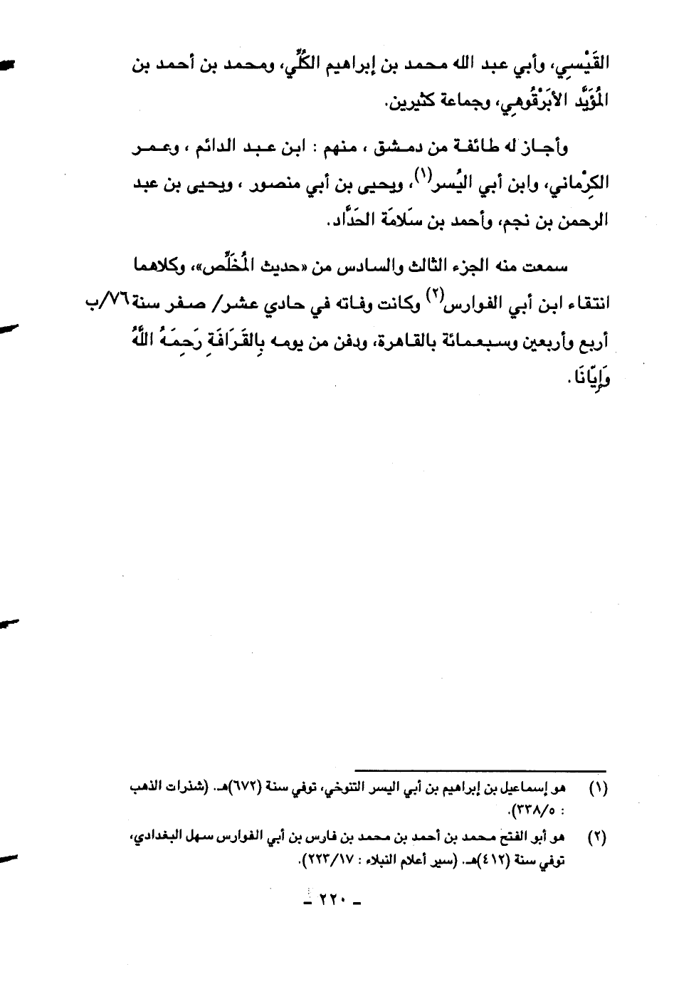 سمعت منه الجزء الثالث والسادس من ((حديث المخلص)) ، وكلاهما انتقاء ابن أبي الفوارس وكانت وفاته في حادي عشر صفر سنة أربع وأربعين وسبعمائة بالقاهرة، ودفن من يومه بالقرافة رحمه الله وإيانا.