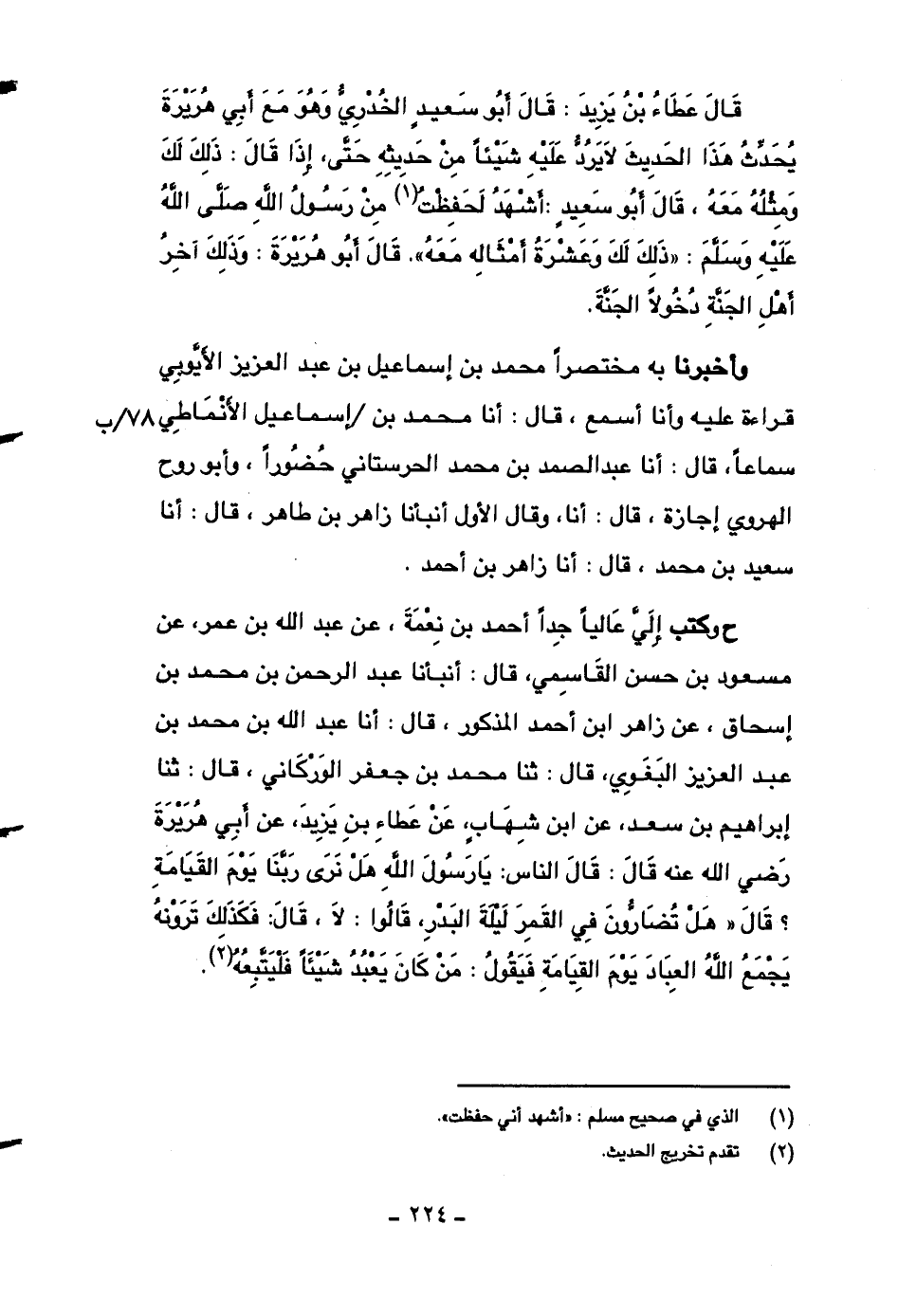 ح وكتب إلي عالياً جداً أحمد بن نعمة، عن عبد الله بن عمر، عن مسعود بن حسن القاسمي، قال: أنبأنا عبد الرحمن بن محمد بن إسحاق، عن زاهر ابن أحمد المذكور، قال: أنا عبد الله بن محمد بن عبد العزيز البغوي، قال: ثنا محمد بن جعفر الوركاني، قال: ثنا إبراهيم بن سعد، عن ابن شهابٍ، عن عطاء بن يزيد، عن أبي هريرة رضي الله عنه قال: قال الناس: يا رسول الله هل نرى ربنا يوم القيامة؟ قال: ((هل تضارون في القمر ليلة البدر، قالوا: لا، قال: فكذلك ترونه يجمع الله العباد يوم القيامة فيقول: من كان يعبد شيئاً فليتبعه.