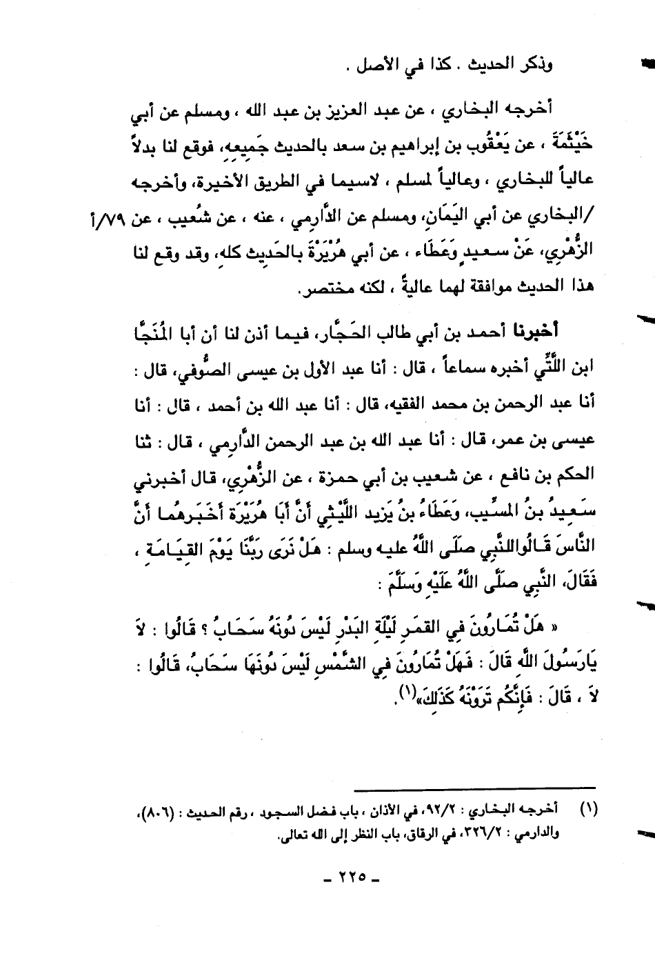 ((هل تمارون في القمر ليلة البدر ليس دونه سحاب؟ قالوا: لا يا رسول الله قال: فهل تمارون في الشمس ليس دونها سحاب، قالوا: لا، قال: فإنكم ترونه كذلك)) .