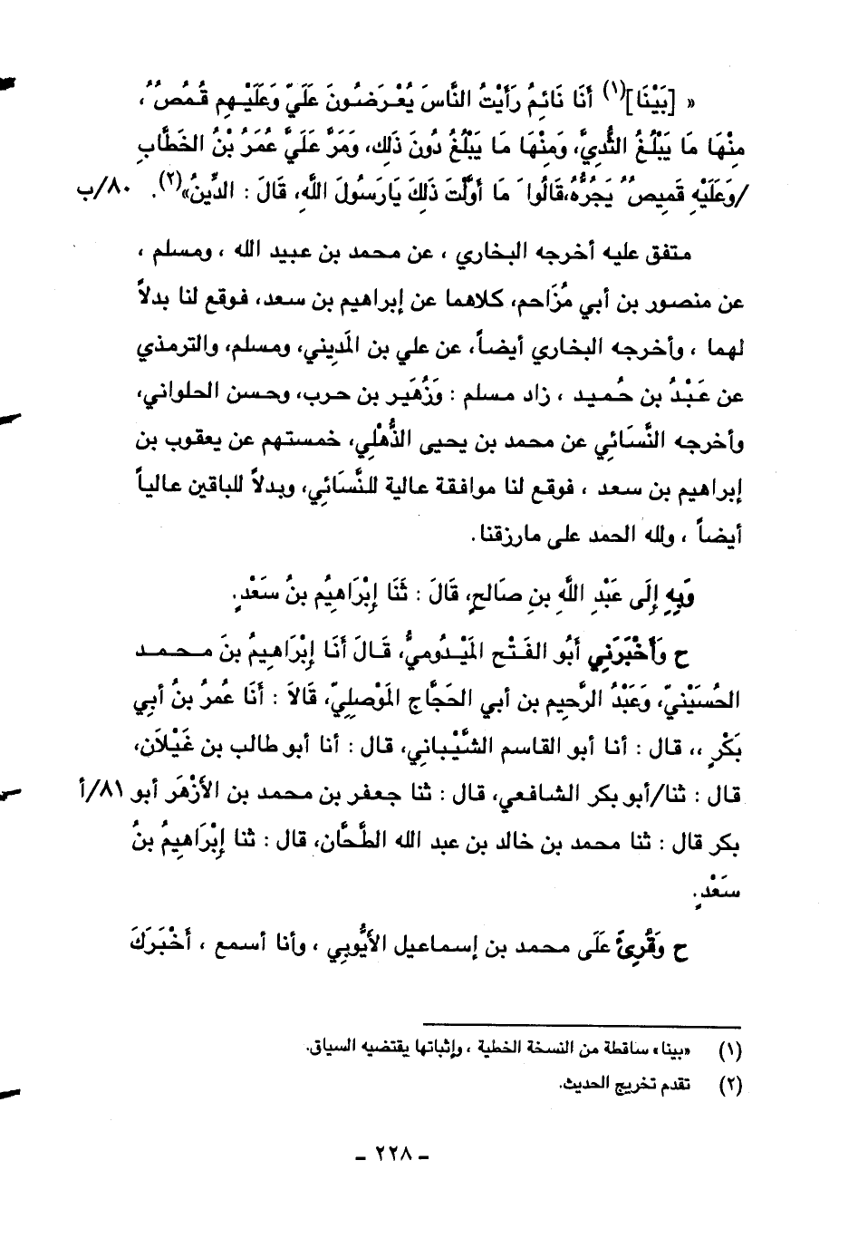 متفق عليه أخرجه البخاري، عن محمد بن عبيد الله، ومسلم، عن منصور بن أبي مزاحم، كلاهما عن إبراهيم بن سعد، فوقع لنا بدلاً لهما، وأخرجه البخاري أيضاً، عن علي بن المديني، ومسلم، والترمذي عن عبد بن حميد، زاد مسلم: وزهير بن حرب، وحسن الحلواني، وأخرجه النسائي عن محمد بن يحيى الذهلي، خمستهم عن يعقوب بن إبراهيم بن سعد، فوقع لنا موافقة عالية للنسائي، وبدلاً للباقين عالياً أيضاً، ولله الحمد على ما رزقنا.