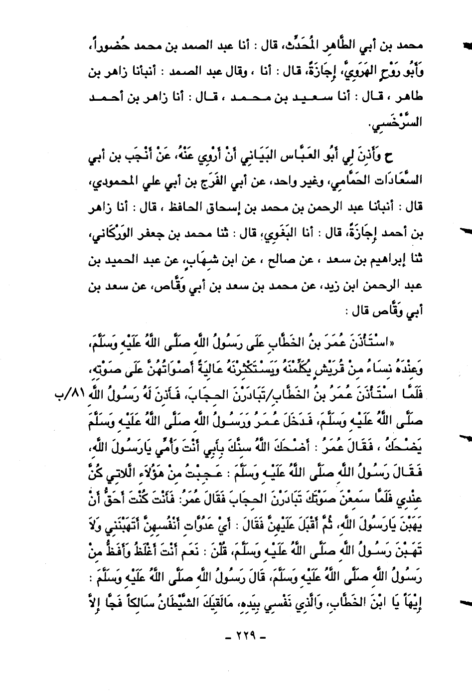 محمد بن أبي الطاهر المحدث، قال: أنا عبد الصمد بن محمد حضوراً، وأبو روحٍ الهروي، إجازةً، قال: أنا، وقال عبد الصمد: أنبأنا زاهر بن طاهر، قال: أنا سعيد بن محمد، قال: أنا زاهر بن أحمد السرخسي.