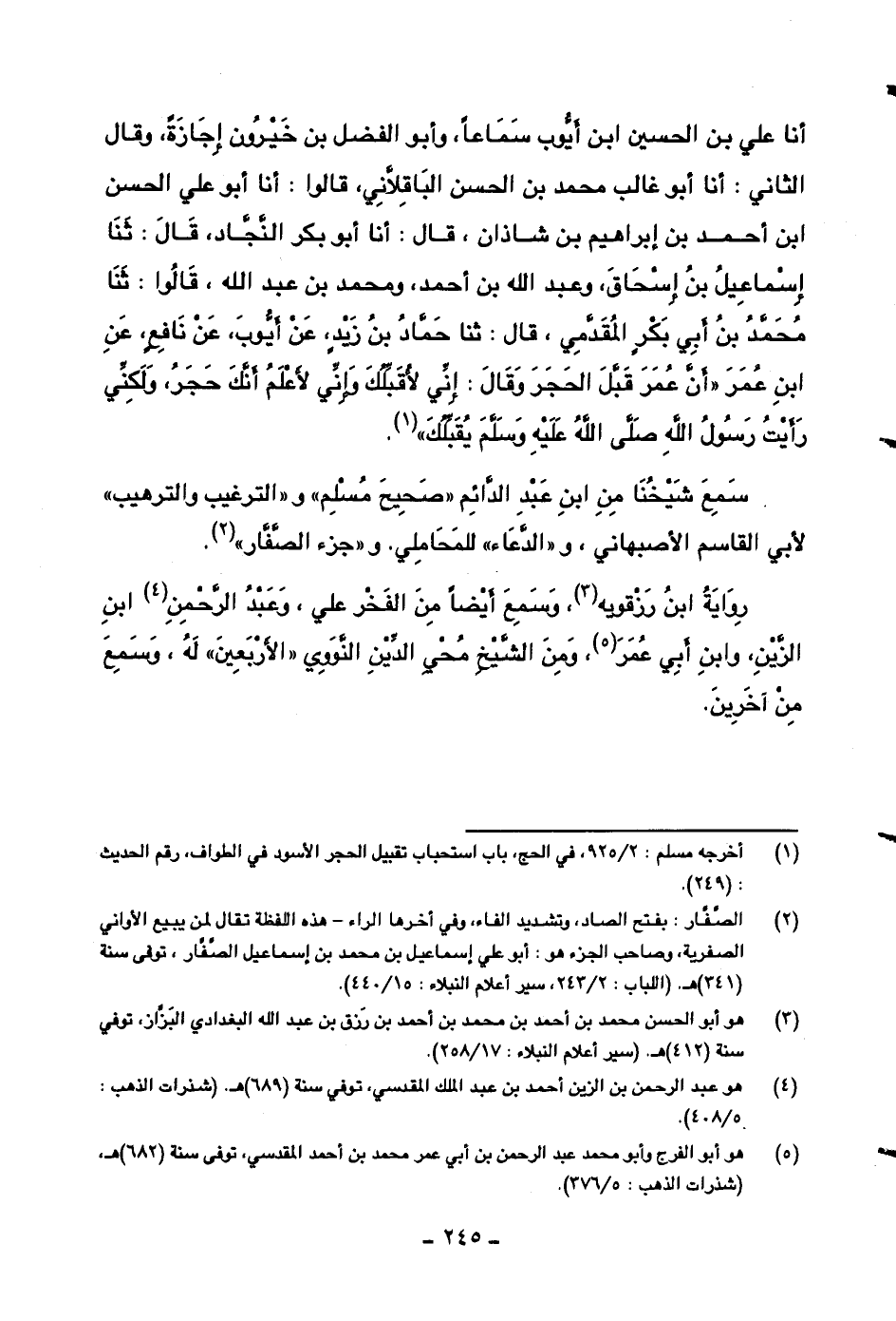 أنا علي بن الحسين ابن أيوب سماعاً، وأبو الفضل بن خيرون إجازةً، وقال الثاني: أنا أبو غالب محمد بن الحسن الباقلاني، قالوا: أنا أبو علي الحسن ابن أحمد بن إبراهيم بن شاذان، قال: أنا أبو بكر النجاد، قال: ثنا إسماعيل بن إسحاق، وعبد الله بن أحمد، ومحمد بن عبد الله، قالوا: ثنا محمد بن أبي بكرٍ المقدمي، قال: ثنا حماد بن زيدٍ، عن أيوب، عن نافعٍ، عن ابن عمر ((أن عمر قبل الحجر وقال: إني لأقبلك وإني لأعلم أنك حجر، ولكني رأيت رسول الله صلى الله عليه وسلم يقبلك)) .