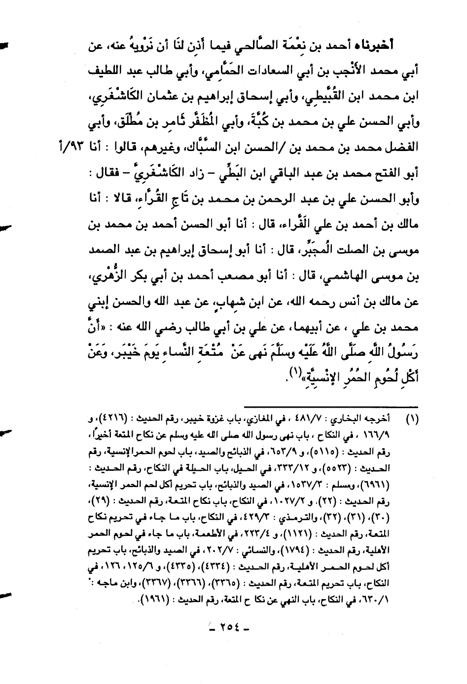 أخبرناه أحمد بن نعمة الصالحي فيما أذن لنا أن نرويه عنه، عن أبي محمد الأنجب بن أبي السعادات الحمامي، وأبي طالب عبد اللطيف ابن محمد ابن القبيطي، وأبي إسحاق إبراهيم بن عثمان الكاشغري، وأبي الحسن علي بن محمد بن كبة، وأبي المظفر ثامر بن مطلق، وأبي الفضل محمد بن محمد بن الحسن ابن السباك، وغيرهم، قالوا: أنا أبو الفتح محمد بن عبد الباقي ابن البطي -زاد الكاشغري- فقال: وأبو الحسن علي بن عبد الرحمن بن محمد بن تاج القراء، قالا: أنا مالك بن أحمد بن علي الفراء، قال: أنا أبو الحسن أحمد بن محمد بن موسى بن الصلت المجبر، قال: أنا أبو إسحاق إبراهيم بن عبد الصمد بن موسى الهاشمي، قال: أنا أبو مصعب أحمد بن أبي بكر الزهري، عن مالك بن أنس رحمه الله، عن ابن شهابٍ، عن عبد الله والحسن ابني محمد بن علي، عن أبيهما، عن علي بن أبي طالب رضي الله عنه: ((أن رسول الله صلى الله عليه وسلم نهى عن متعة النساء يوم خيبر، وعن أكل لحوم الحمر الإنسية)) .