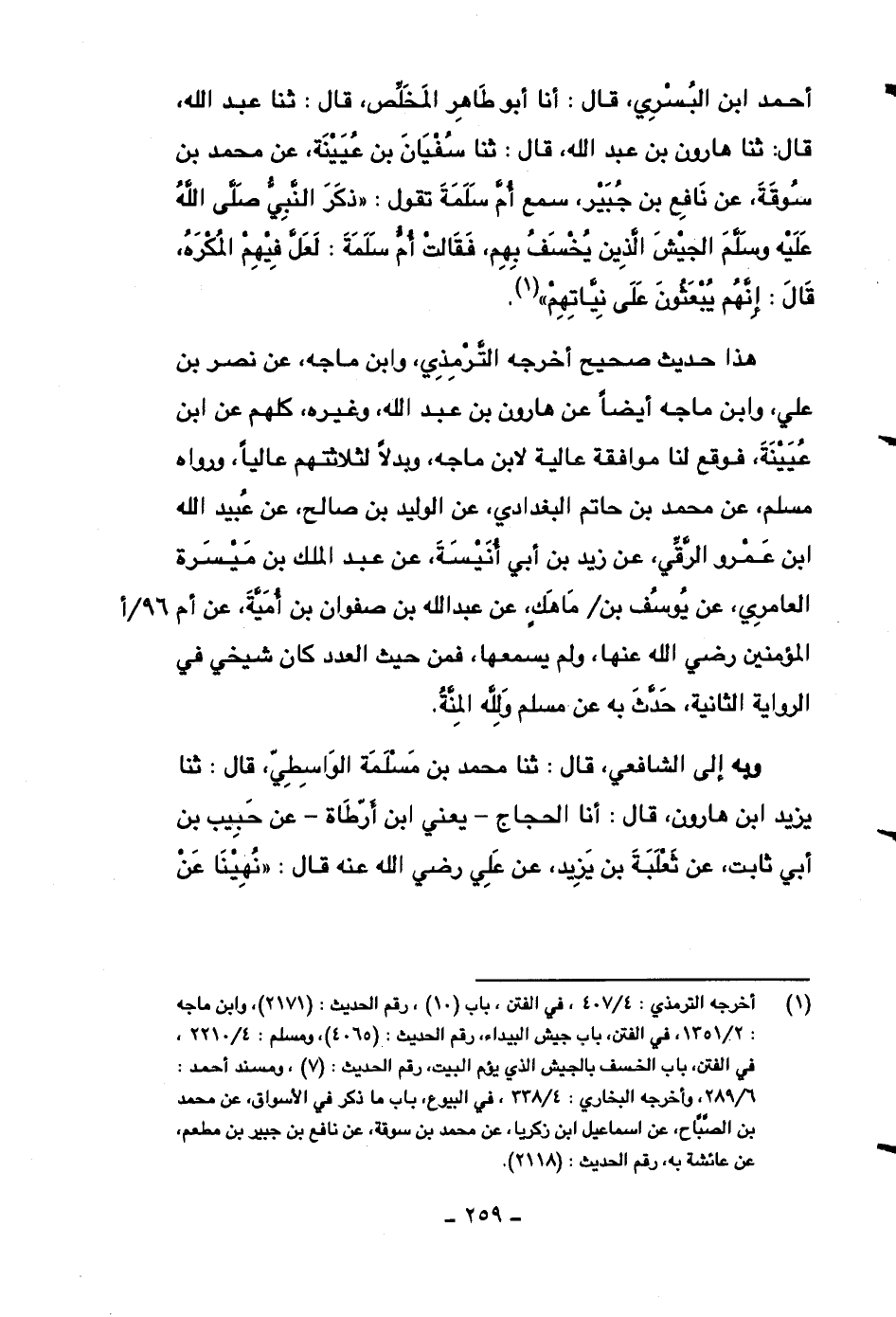 أحمد ابن البسري، قال: أنا أبو طاهر المخلص، قال: ثنا عبد الله، قال: ثنا هارون بن عبد الله، قال: ثنا سفيان بن عيينة، عن محمد بن سوقة، عن نافع بن جبير، سمع أم سلمة تقول: ((ذكر النبي صلى الله عليه وسلم الجيش الذي يخسف بهم، فقالت أم سلمة: لعل فيهم المكره، قال: إنهم يبعثون على نياتهم)) .