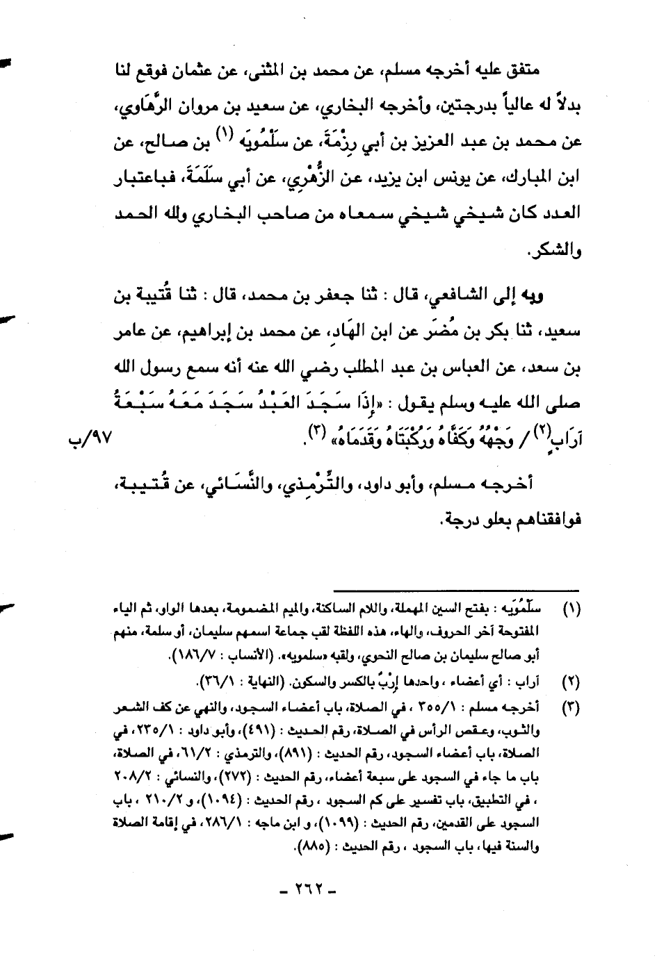 وبه إلى الشافعي، قال: ثنا جعفر بن محمد، قال: ثنا قتيبة بن سعيد، ثنا بكر بن مضر عن ابن الهاد، عن محمد بن إبراهيم، عن عامر بن سعد، عن العباس بن عبد المطلب رضي الله عنه أنه سمع رسول الله صلى الله عليه وسلم يقول: ((إذا سجد العبد سجد معه سبعة آرابٍ وجهه وكفاه وركبتاه وقدماه)) .