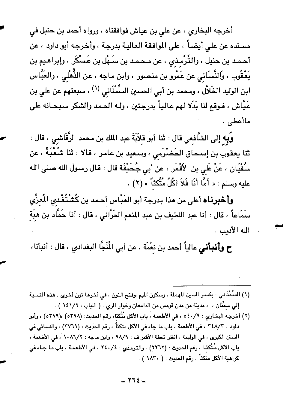 أخرجه البخاري، عن علي بن عياش فوافقناه، ورواه أحمد بن حنبل في مسنده عن علي أيضاً، على الموافقة العالية بدرجة، وأخرجه أبو داود، عن أحمد بن حنبل، والترمذي، عن محمد بن سهل بن عسكر، وإبراهيم بن يعقوب، والنسائي عن عمرو بن منصور، وابن ماجه، عن الذهلي، والعباس ابن الوليد الخلال، ومحمد بن أبي الحسين السمناني، سبعتهم عن علي بن عياش، فوقع لنا بدلاً لهم عالياً بدرجتين، ولله الحمد والشكر سبحانه على ما أعطى.