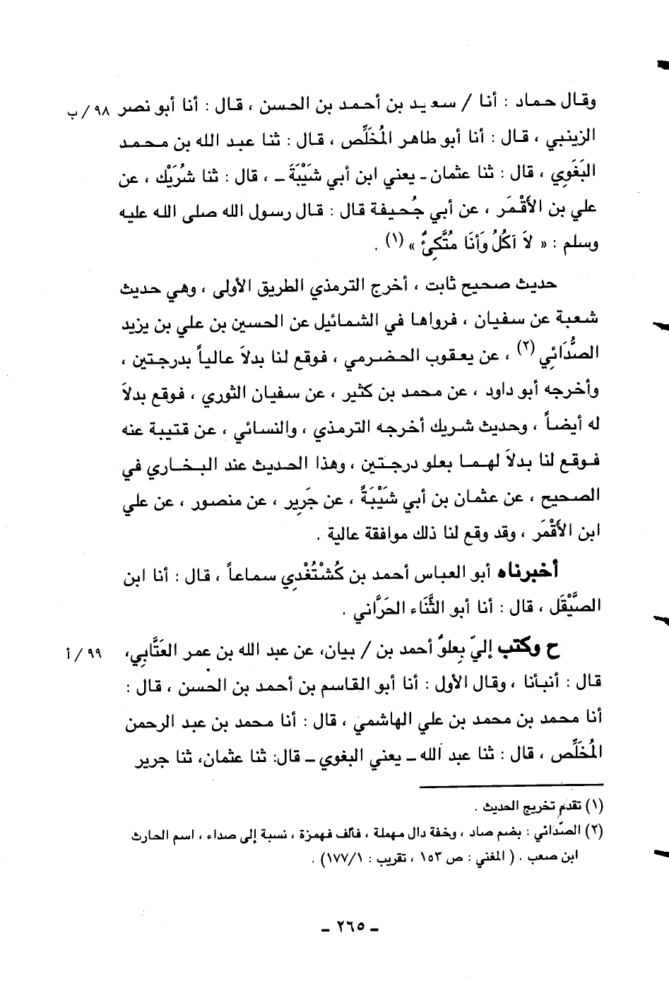 وقال حماد: أنا سعيد بن أحمد بن الحسن، قال: أنا أبو نصر الزينبي، قال: أنا أبو طاهر المخلص، قال: ثنا عبد الله بن محمد البغوي، قال: ثنا عثمان -يعني ابن أبي شيبة-، قال: ثنا شريك، عن علي بن الأقمر، عن أبي جحيفة قال: قال رسول الله صلى الله عليه وسلم: ((لا آكل وأنا متكئ)) .