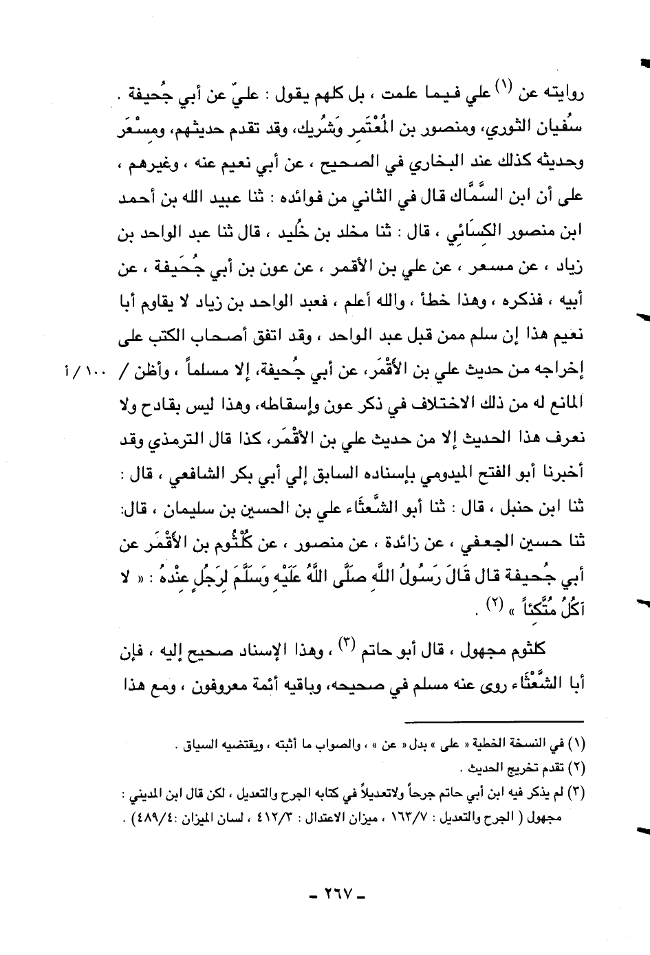 روايته عن علي فيما علمت، بل كلهم يقول: علي عن أبي جحيفة. سفيان الثوري، ومنصور بن المعتمر وشريك، وقد تقدم حديثهم، ومسعر وحديثه كذلك عند البخاري في الصحيح، عن أبي نعيم عنه، وغيرهم، على أن ابن السماك قال في الثاني من فوائده: ثنا عبيد الله بن أحمد ابن منصور الكسائي، قال: ثنا مخلد بن خليد، قال ثنا عبد الواحد بن زياد، عن مسعر، عن علي بن الأقمر، عن عون بن أبي جحيفة، عن أبيه، فذكره، وهذا خطأ، والله أعلم، فعبد الواحد بن زياد لا يقاوم أبا نعيم هذا إن سلم ممن قبل عبد الواحد، وقد اتفق أصحاب الكتب على إخراجه من حديث علي بن الأقمر، عن أبي جحيفة، إلا مسلماً، وأظن المانع له من ذلك الاختلاف في ذكر عون وإسقاطه، وهذا ليس بقادح ولا نعرف هذا الحديث إلا من حديث علي بن الأقمر، كذا قال الترمذي وقد أخبرنا أبو الفتح الميدومي بإسناده السابق إلى أبي بكر الشافعي، قال: ثنا ابن حنبل، قال: ثنا أبو الشعثاء علي بن الحسين بن سليمان، قال: ثنا حسين الجعفي، عن زائدة، عن منصور، عن كلثوم بن الأقمر عن أبي جحيفة قال: قال رسول الله صلى الله عليه وسلم لرجل عنده: ((لا آكل متكئاً)) .