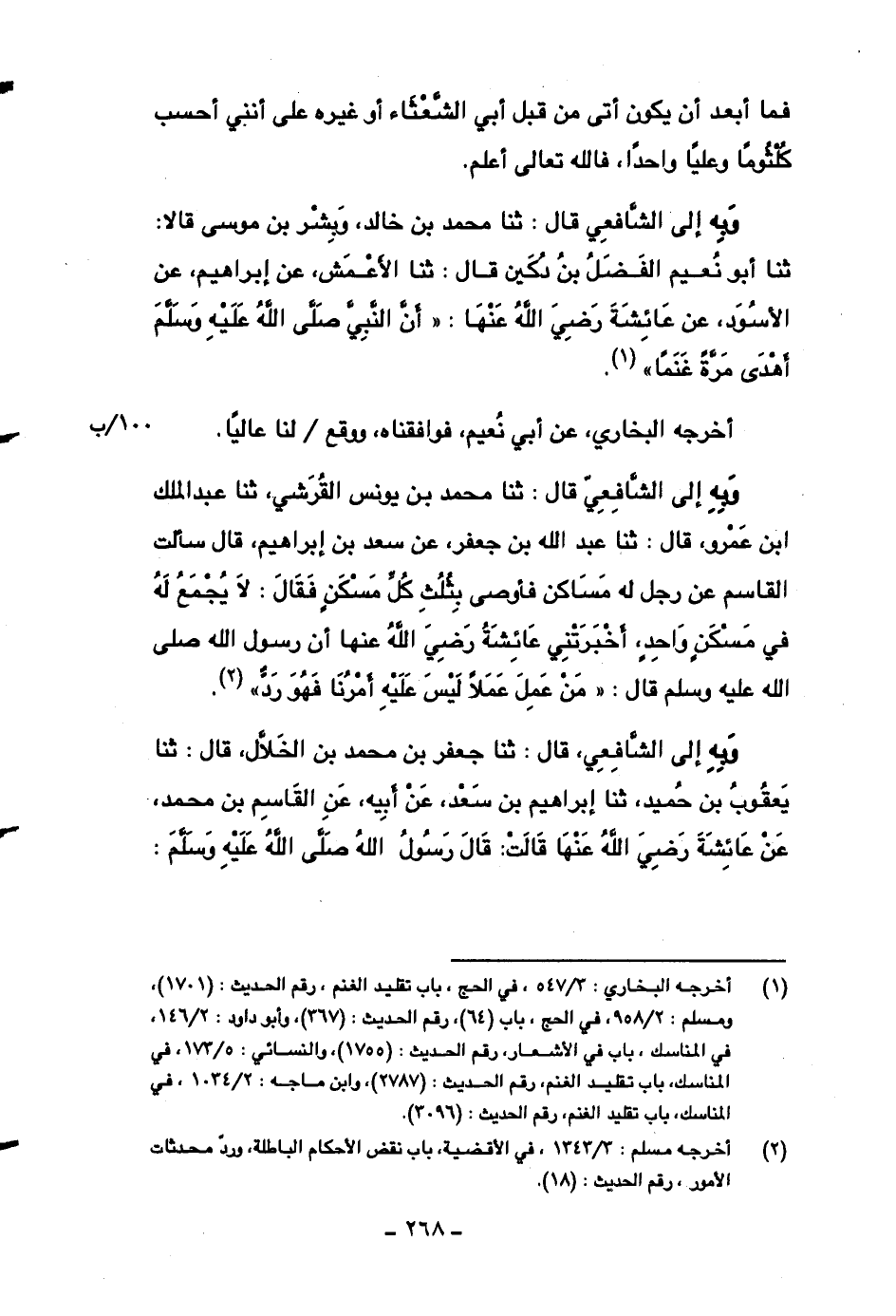 وبه إلى الشافعي قال: ثنا محمد بن خالد، وبشر بن موسى قال: ثنا أبو نعيم الفضل بن دكين قال: ثنا الأعمش، عن إبراهيم، عن الأسود، عن عائشة رضي الله عنها: ((أن النبي صلى الله عليه وسلم أهدى مرةً غنماً)) .