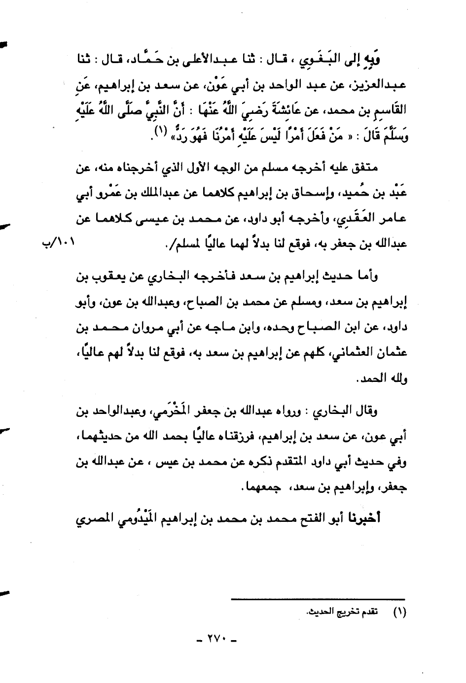وأما حديث إبراهيم بن سعد فأخرجه البخاري عن يعقوب بن إبراهيم بن سعد، ومسلم عن محمد بن الصباح، وعبد الله بن عون، وأبو داود، عن ابن الصباح وحده، وابن ماجه عن أبي مروان محمد بن عثمان العثماني، كلهم عن إبراهيم بن سعد به، فوقع لنا بدلاً لهم عالياً، ولله الحمد.
