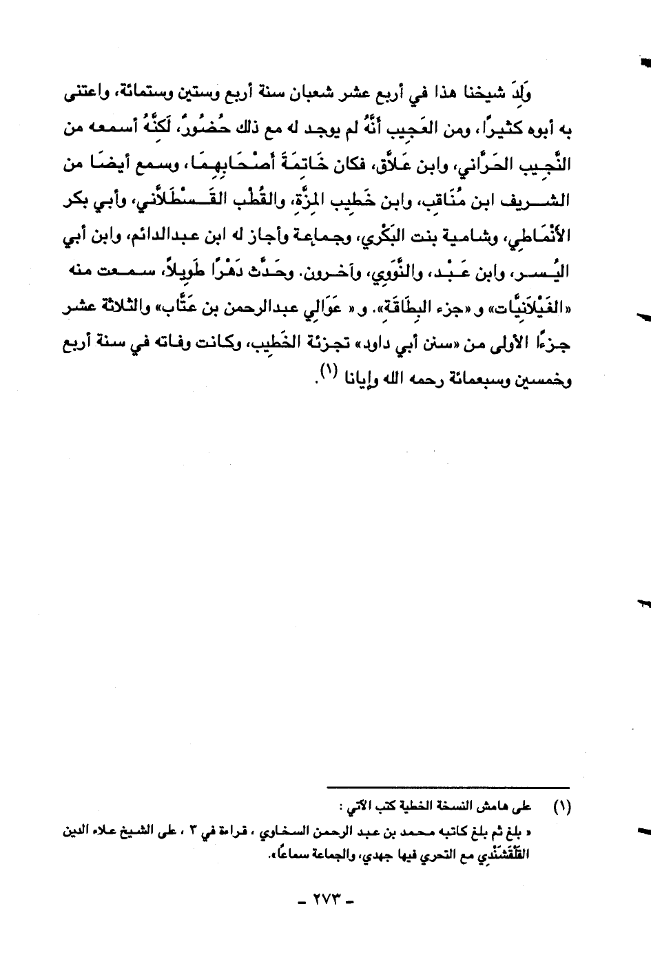 ولد شيخنا هذا في أربع عشر شعبان سنة أربع وستين وستمائة، واعتنى به أبوه كثيراً، ومن العجيب أنه لم يوجد له مع ذلك حضورٌ، لكنه أسمعه من النجيب الحراني، وابن علاق، فكان خاتمة أصحابهما، وسمع أيضاً من الشريف ابن مناقب، وابن خطيب المزة، والقطب القسطلاني، وأبي بكر الأنماطي، وشامية بنت البكري، وجماعة وأجاز له ابن عبد الدائم، وابن أبي اليسر، وابن عبد، والنووي، وآخرون، وحدث دهراً طويلاً، سمعت منه ((الغيلانيات)) و ((جزء البطاقة)) و ((عوالي عبد الرحمن بن عتاب)) والثلاثة عشر جزءاً الأولى من ((سنن أبي داود)) تجزئة الخطيب، وكانت وفاته في سنة أربع وخمسين وسبعمائة رحمه الله وإيانا.