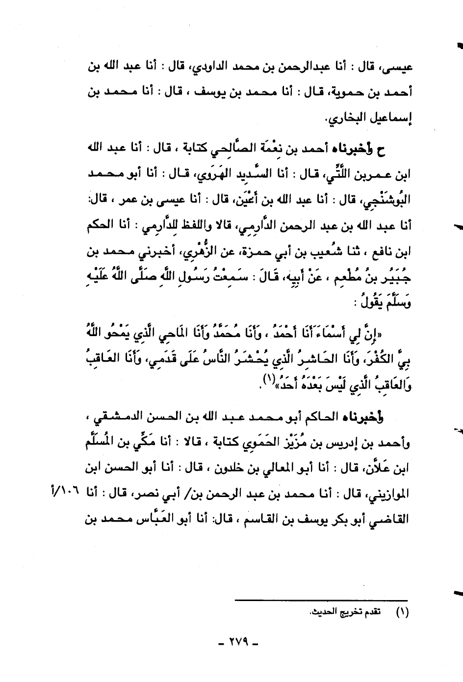 عيسى، قال: أنا عبد الرحمن بن محمد الداودي، قال: أنا عبد الله بن أحمد بن حمويه، قال: أنا محمد بن يوسف، قال: أنا محمد بن إسماعيل البخاري.