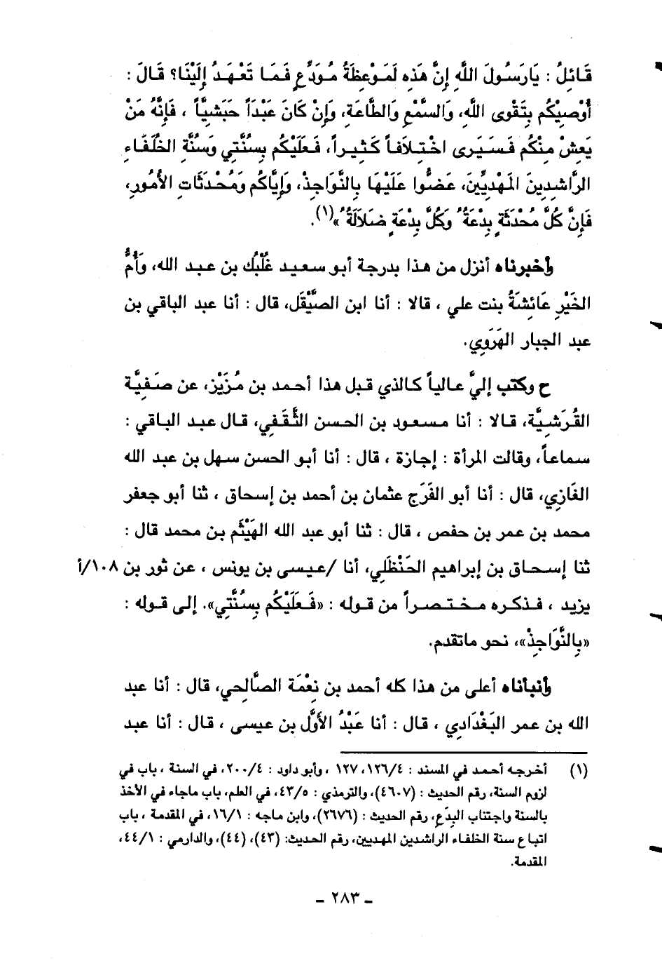 ح وكتب إلي عالياً كالذي قبل هذا أحمد بن مزيز، عن صفية القرشية، قالا: أنا مسعود بن الحسن الثقفي، قال عبد الباقي: سماعاً، وقالت المرأة: إجازة، قال: أنا أبو الحسن سهل بن عبد الله الغازي، قال: أنا أبو الفرج عثمان بن أحمد بن إسحاق، ثنا أبو جعفر محمد بن عمر بن حفص، قال: ثنا أبو عبد الله الهيثم بن محمد قال: ثنا إسحاق بن إبراهيم الحنظلي، أنا عيسى بن يونس، عن ثور بن يزيد، فذكره مختصراً من قوله: ((فعليكم بسنتي) . إلى قوله: ((بالنواجذ)) ، نحو ما تقدم.
