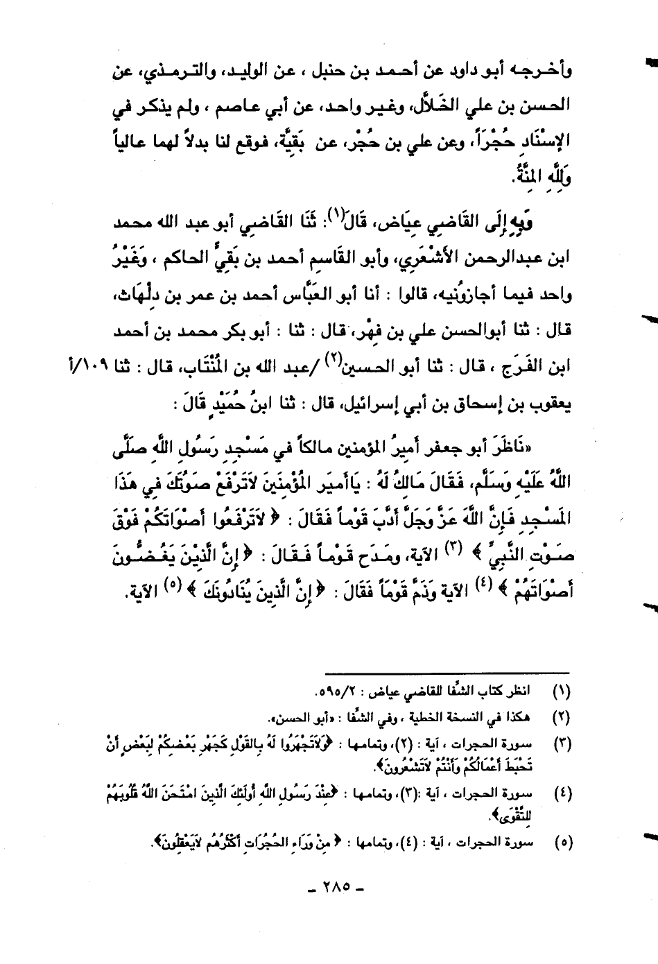 ((ناظر أبو جعفر أمير المؤمنين مالكاً في مسجد رسول الله صلى الله عليه وسلم، فقال مالك له: يا أمير المؤمنين لا ترفع صوتك في هذا المسجد فإن الله عز وجل أدب قوماً فقال: {لا ترفعوا أصواتكم فوق صوت النبي} الآية، ومدح قوماً فقال: {إن الذين يغضون أصواتهم} الآية وذم قوماً فقال: {إن الذين ينادونك} الآية.