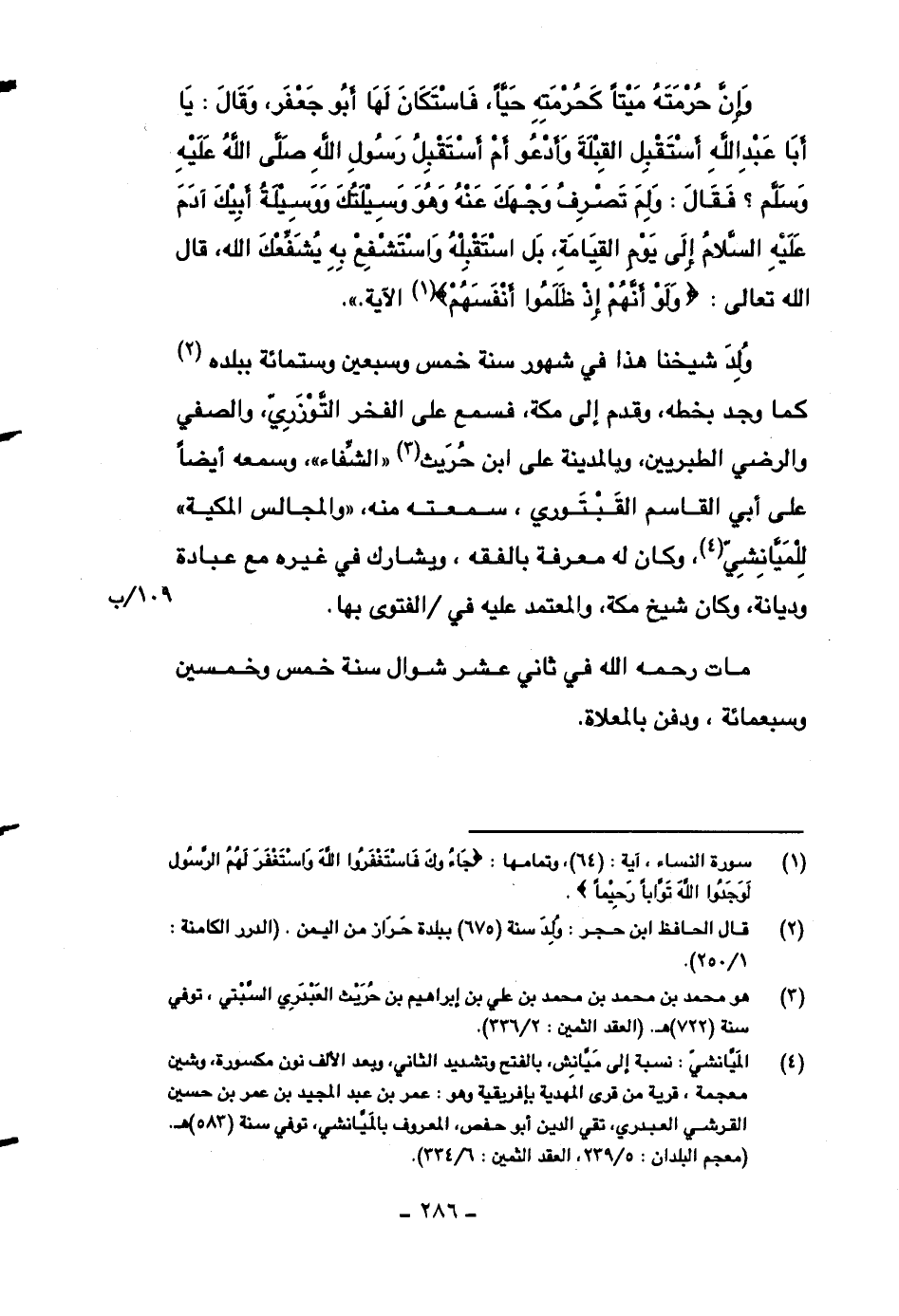 وإن حرمته ميتاً كحرمته حياً، فاستكان لها أبو جعفر، وقال: يا أبا عبد الله استقبل القبلة وأدعو أم أستقبل رسول الله صلى الله عليه وسلم؟ فقال: ولم تصرف وجهك عنه وهو وسيلتك ووسيلة أبيك، آدم عليه السلام إلى يوم القيامة، بل استقبله واستشفع به يشفعك الله، قال الله تعالى: {ولو أنهم إذ ظلموا أنفسهم} الآية)) .