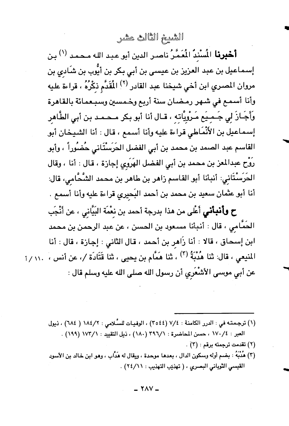 ح وأنبأني أعلى من هذا بدرجة أحمد بن نعمة البياني، عن أنجب الحمامي، قال: أنبأنا مسعود بن الحسن، عن عبد الرحمن بن محمد ابن إسحاق، قالا: أنا زاهر بن أحمد، قال الثاني: إجازة، قال: أنا المنيعي، قال: ثنا هدبة، ثنا همام بن يحيى، ثنا قتادة، عن أنس، عن أبي موسى الأشعري أن رسول الله صلى الله عليه وسلم قال: