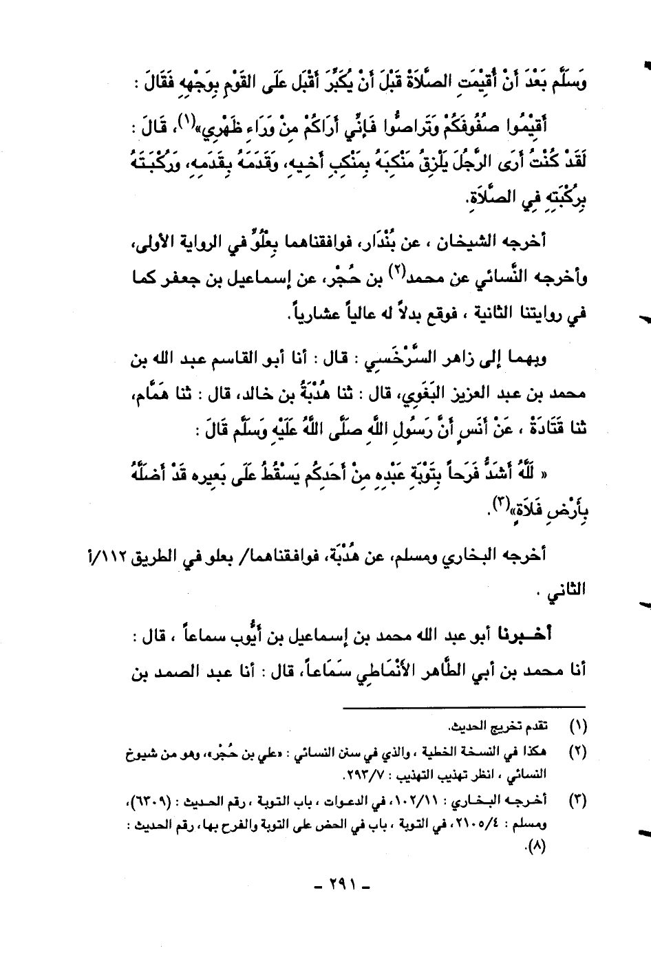 أخرجه الشيخان، عن بندار، فوافقناهما بعلو في الرواية الأولى، وأخرجه النسائي عن محمد بن حجر، عن إسماعيل بن جعفر كما في روايتنا الثانية، فوقع بدلاً له عالياً عشارياً.