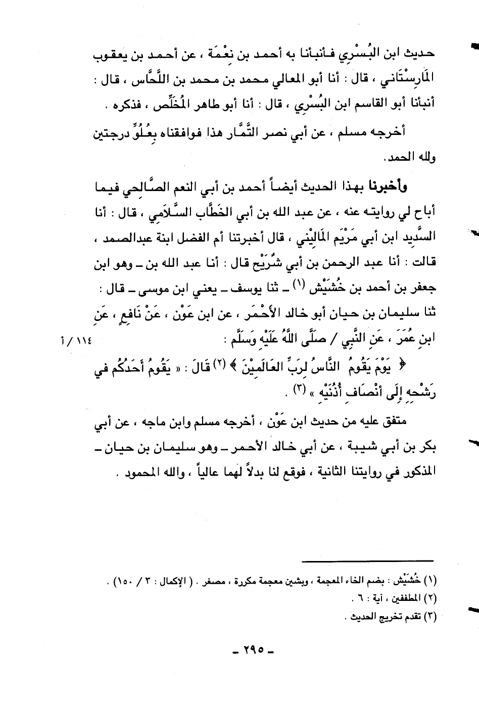 وأخبرنا بهذا الحديث أيضاً أحمد بن أبي النعم الصالحي فيما أباح لي روايته عنه، عن عبد الله بن أبي الخطاب السلامي، قال: أنا السديد ابن أبي مريم الماليني، قال: أخبرتنا أم الفضل ابنة عبد الصمد، قالت: أنا عبد الرحمن بن أبي شريح قال: أنا عبد الله بن -وهو ابن جعفر بن أحمد بن خشيش- ثنا يوسف -يعني ابن موسى- قال: ثنا سليمان بن حيان أبو خالد الأحمر، عن ابن عون، عن نافعٍ، عن ابن عمر، عن النبي صلى الله عليه وسلم: