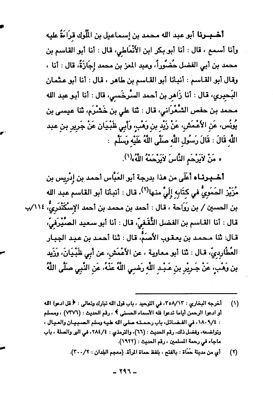 أخبرناه أعلى من هذا بدرجة أبو العباس أحمد بن إدريس بن مزيز الحموي في كتابه إلي منها، قال: أنبأنا أبو القاسم عبد الله بن الحسين بن رواحة، قال: أحمد بن محمد بن أحمد الإسكندري، قال: أنا القاسم بن الفضل الثقفي، قال: أنا أبو سعيد الصيرفي، قال: ثنا محمد بن يعقوب الأصم، قال: ثنا أحمد بن عبد الجبار العطاردي، قال: ثنا أبو معاوية، عن الأعمش، عن أبي ظبيان، وزيد بن وهبٍ، عن جرير بن عبد الله رضي الله عنه، عن النبي صلى الله عليه وسلم