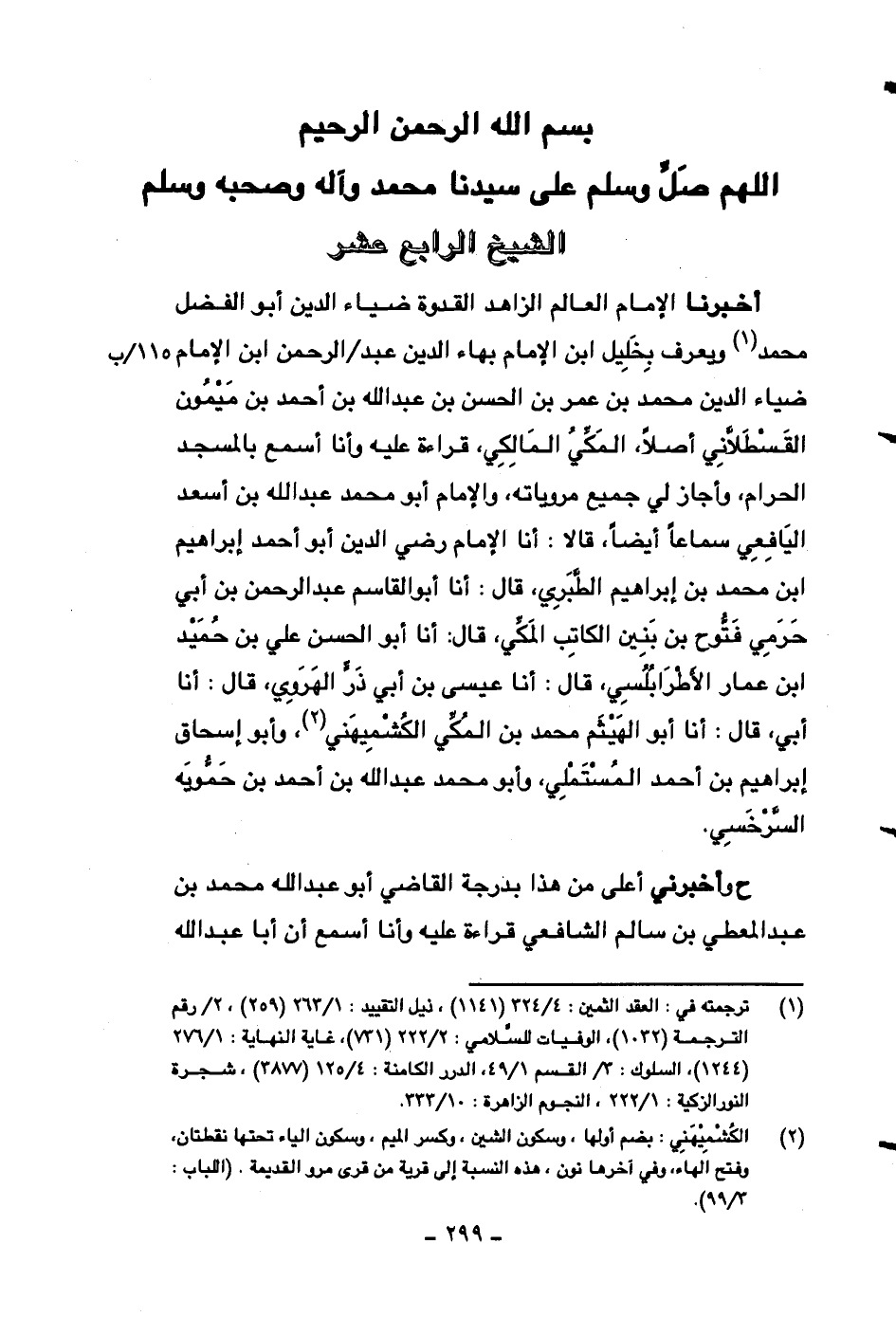 ح وأخبرني أعلى من هذا بدرجة القاضي أبو عبد الله محمد بن عبد المعطي بن سالم الشافعي قراءة عليه وأنا أسمع أن أبا عبد الله