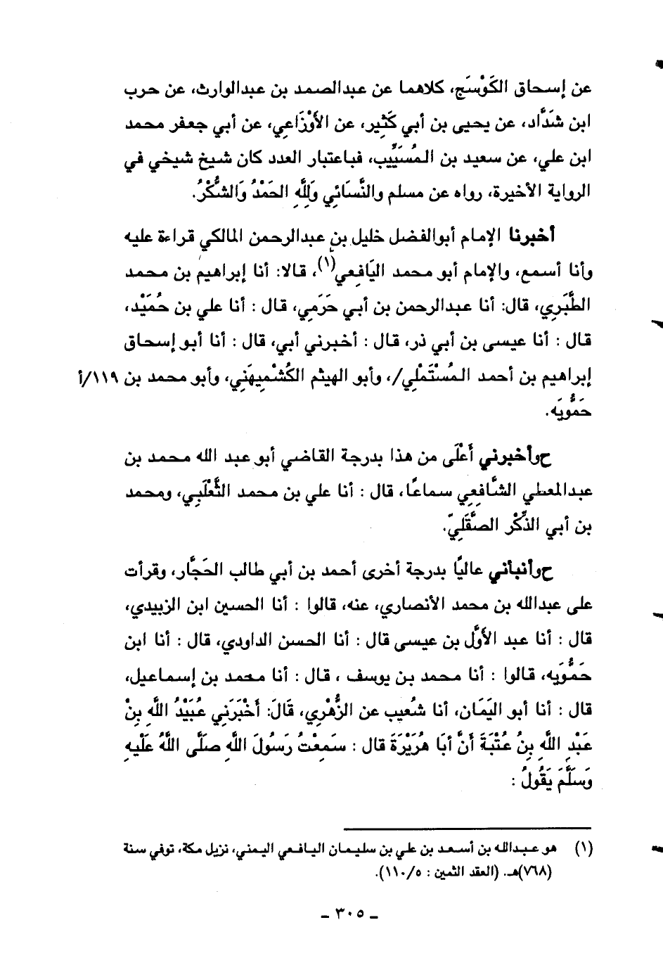 أخبرنا الإمام أبو الفضل خليل بن عبد الرحمن المالكي قراءة عليه وأنا أسمع، والإمام أبو محمد اليافعي، قالا: أنا إبراهيم بن محمد الطبري، قال: أنا عبد الرحمن بن أبي حرمي، قال: أنا علي بن حميد، قال: أنا عيسى بن أبي ذر، قال: أخبرني أبي، قال: أنا أبو إسحاق إبراهيم بن أحمد المستملي، وأبو الهيثم الكشميهني، وأبو محمد بن حمويه.