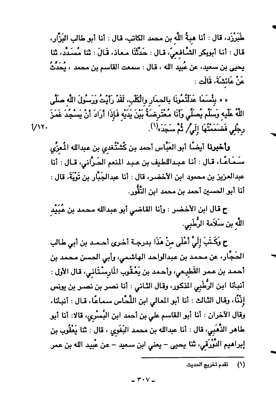 طبرزد، قال: أنا هبة الله بن محمد الكاتب، قال: أنا أبو طالب البزار، قال: أنا أبو بكر الشافعي، قال: حدثنا معاذ، قال: ثنا مسدد، ثنا يحيى بن سعيد، عن عبيد الله. قال: سمعت القاسم بن محمد، يحدث عن عائشة، قالت: