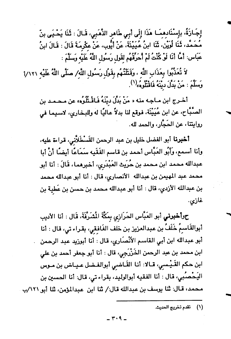 إجازةً، بإسنادهما هذا إلى أبي طاهر الذهبي، قال: ثنا يحيى بن محمد، ثنا لوين، ثنا ابن عيينة، عن أيوب، عن عكرمة قال: قال ابن عباس: أما أنا لو كنت لم أحرقهم لقول رسول الله صلى الله عليه وسلم: