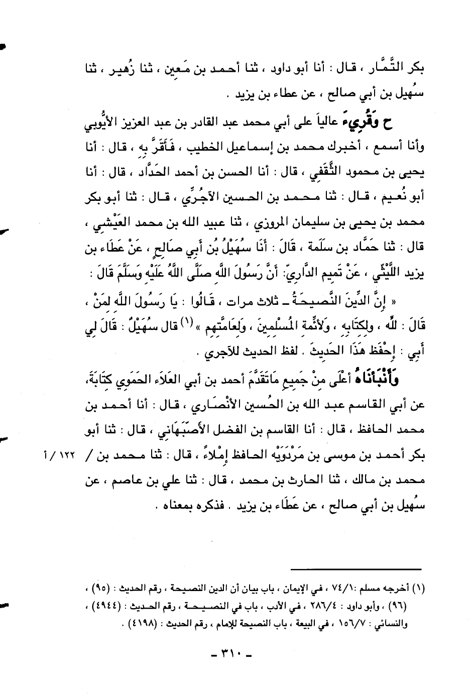 ((إن الدين النصيحة -ثلاث مرات-، قالوا: يا رسول الله لمن، قال: لله، ولكتابه، ولأئمة المسلمين، ولعامتهم)) قال سهيلٌ: قال لي أبي: إحفظ هذا الحديث. لفظ الحديث للآجري.