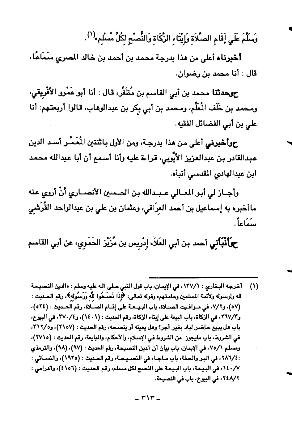 ح وأخبرني أعلى من هذا بدرجة، ومن الأول باثنتين المعمر أسد الدين عبد القادر بن عبد العزيز الأيوبي، قراءة عليه وأنا أسمع أن أبا عبد الله محمد ابن عبد الهادي المقدسي أنبأه.