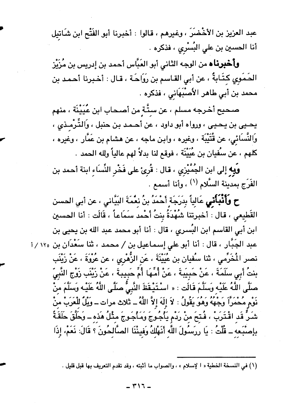ح وأنبأني عالياً بدرجة أحمد بن نعمة البياني، عن أبي الحسن القطيعي، قال: أخبرتنا شهدة بنت أحمد سماعاً، قالت: أنا الحسين ابن أبي القاسم ابن البسري، قال: أنا أبو محمد عبد الله بن يحيى بن عبد الجبار، قال: أنا أبو علي إسماعيل بن محمد، ثنا سعدان بن نصر المخرمي، ثنا سفيان بن عيينة، عن الزهري، عن عروة، عن زينب بنت أبي سلمة، عن حبيبة، عن أمها أم حبيبة، عن زينب زوج النبي صلى الله عليه وسلم قالت: ((استيقظ النبي صلى الله عليه وسلم من نومٍ محمراً وجهه وهو يقول: لا إله إلا الله -ثلاث مرات- ويلٌ للعرب من شر قد اقترب، فتح من ردم يأجوج ومأجوج مثل هذه -وحلق حلقةٍ بإصبعه- قلت: يا رسول الله أنهلك وفينا الصالحون؟ قال: نعم، إذا