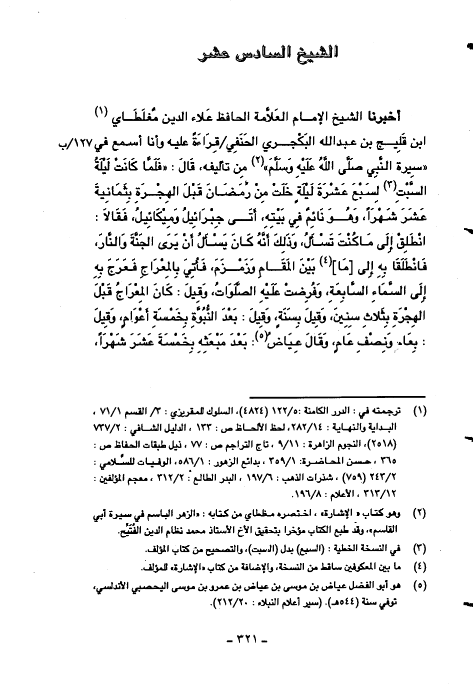 أخبرنا الشيخ الإمام العلامة الحافظ علاء الدين مغلطاي ابن قليج بن عبد الله البكجري الحنفي قراءةً عليه وأنا أسمع في ((سيرة النبي صلى الله عليه وسلم)) من تأليفه، قال: ((فلما كانت ليلة السبت لسبع عشرة ليلةٍ خلت من رمضان قبل الهجرة بثمانية عشر شهراً، وهو نائمٌ في بيته، أتى جبرائيل وميكائيل، فقالا: انطلق إلى ما كنت تسأل، وذلك أنه كان يسأل أن يرى الجنة والنار، فانطلقا به إلى [ما] بين المقام وزمزم، فأتي بالمعراج فعرج به إلى السماء السابعة، وفرضت عليه الصلوات، وقيل: كان المعراج قبل الهجرة بثلاث سنين، وقيل بسنةٍ، وقيل: بعد النبوة بخمسة أعوامٍ، وقيل: بعام ونصف عامٍ، وقال عياض: بعد مبعثه بخمسة عشر شهراً،