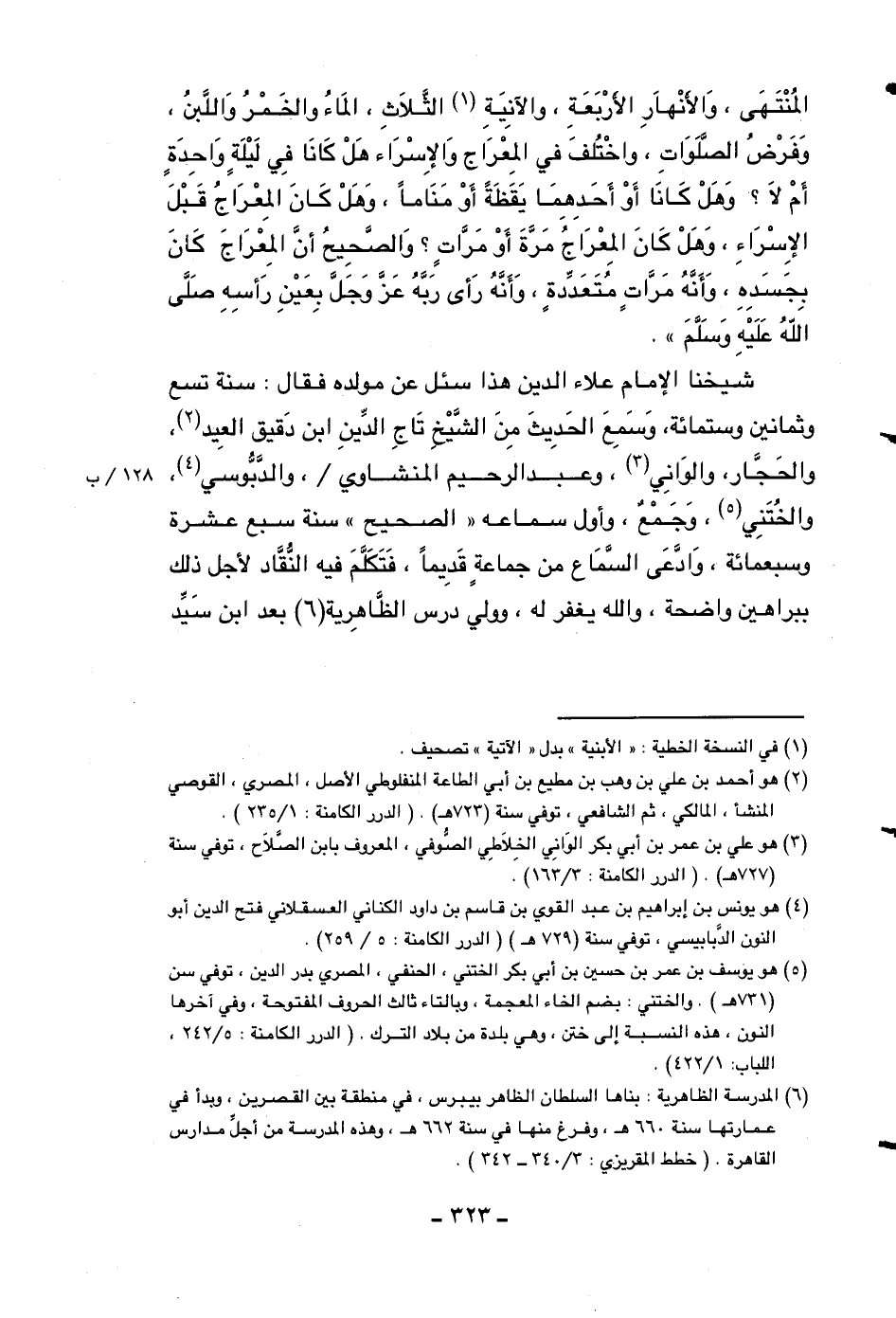 المنتهى، والأنهار الأربعة، والآنية الثلاث، الماء والخمر واللبن، وفرض الصلوات، واختلف في المعراج والإسراء هل كانا في ليلةٍ واحدةٍ أم لا؟ وهل كانا أو أحدهما يقظةً أو مناماً، وهل كان المعراج قبل الإسراء، وهل كان المعراج مرة أو مراتٍ؟ والصحيح أن المعراج كان بجسده، وأنه مراتٍ متعددةٍ، وأنه رأى ربه عز وجل بعين رأسه صلى الله عليه وسلم)) .