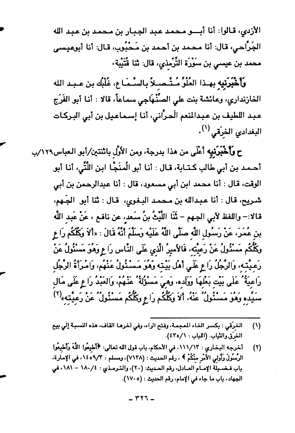 ح وأخبرنيه أعلى من هذا بدرجة، ومن الأول باثنتين أبو العباس أحمد بن أبي طالب كتابة، قال: أنا أبو المنجا ابن اللتي، أنا أبو الوقت، قال: أنا محمد بن أبي مسعود، قال: أنا عبد الرحمن بن أبي شريح، قال: أنا عبد الله بن محمد البغوي، قال: ثنا أبو الجهم، قالا: -واللفظ لأبي الجهم- ثنا الليث بن سعدٍ، عن نافع، عن عبد الله بن عمر، عن رسول الله صلى الله عليه وسلم أنه قال: ((ألا وكلكم راعٍ وكلكم مسئول عن رعيته، فالأمير الذي على الناس راعٍ وهو مسئول عن رعيته، والرجل راعٍ على أهل بيته وهو مسئول عنهم، وامرأة الرجل راعيةٌ على بيت بعلها وولده، وهي مسئولة عنهم، والعبد راعٍ على مال سيده وهو مسئول عنه، ألا وكلكم راعٍ وكلكم مسئول عن رعيته)) .