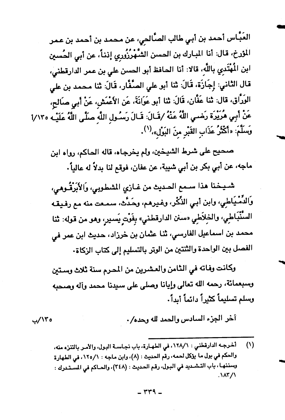 العباس أحمد بن أبي طالب الصالحي، عن محمد بن أحمد بن عمر المؤرخ، قال: أنا المبارك بن الحسن الشهرزوري إذناً، عن أبي الحسين ابن المهتدي بالله، قالا: أنا الحافظ أبو الحسن علي بن عمر الدارقطني، قال الثاني: إجازة، قال: ثنا أبو علي الصفار، قال: ثنا محمد بن علي الوراق، قال: ثنا عفان، قال: ثنا أبو عوانة، عن الأعمش، عن أبي صالحٍ، عن أبي هريرة رضي الله عنه قال: قال رسول الله صلى الله عليه وسلم: ((أكثر عذاب القبر من البول)) .