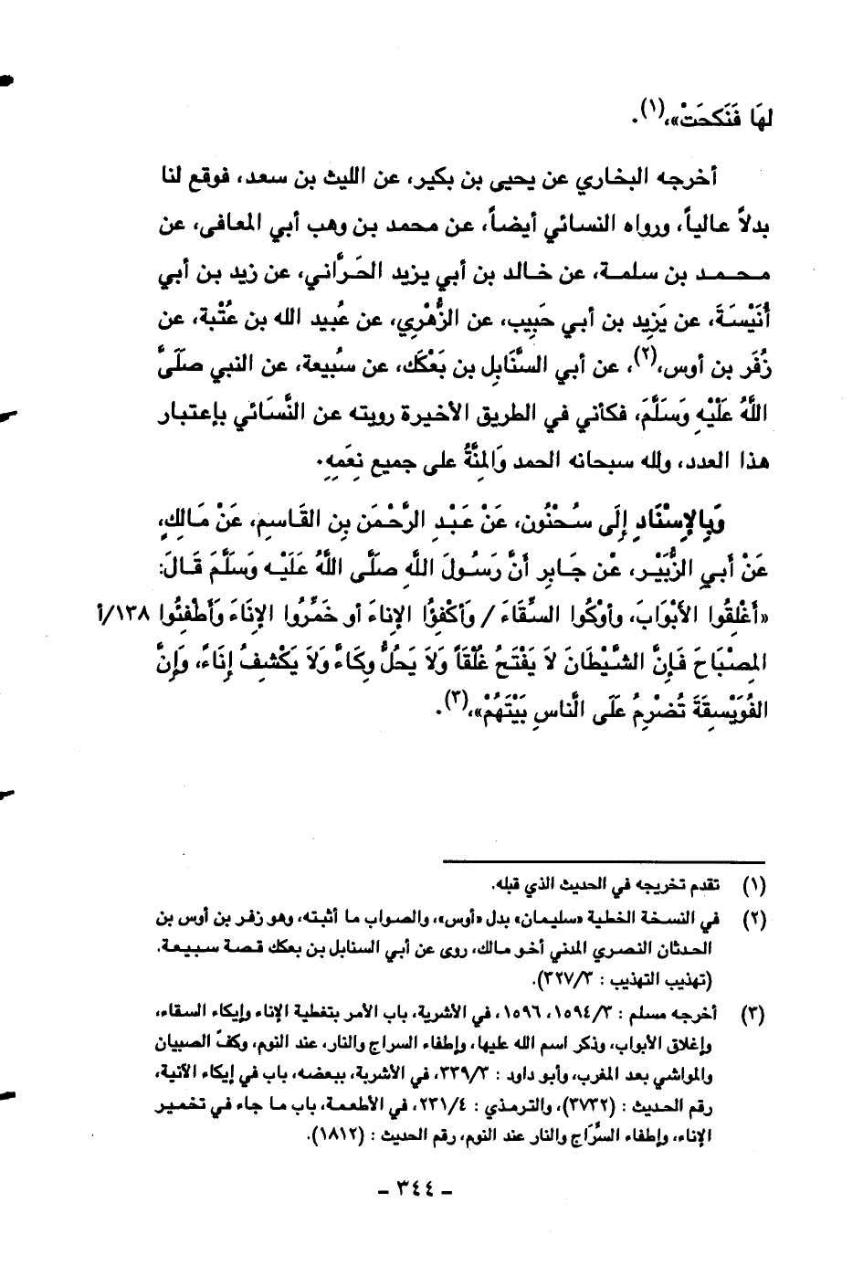 وبالإسناد إلى سحنون، عن عبد الرحمن بن القاسم، عن مالكٍ، عن أبي الزبير، عن جابر أن رسول الله صلى الله عليه وسلم قال: ((أغلقوا الأبواب، وأوكوا السقاء واكفؤا الإناء أو خمروا الإناء وأطفئوا المصباح فإن الشيطان لا يفتح غلقاً ولا يحل وكاءً ولا يكشف إناءً، وإن الفويسقة تضرم على الناس بيتهم)) .