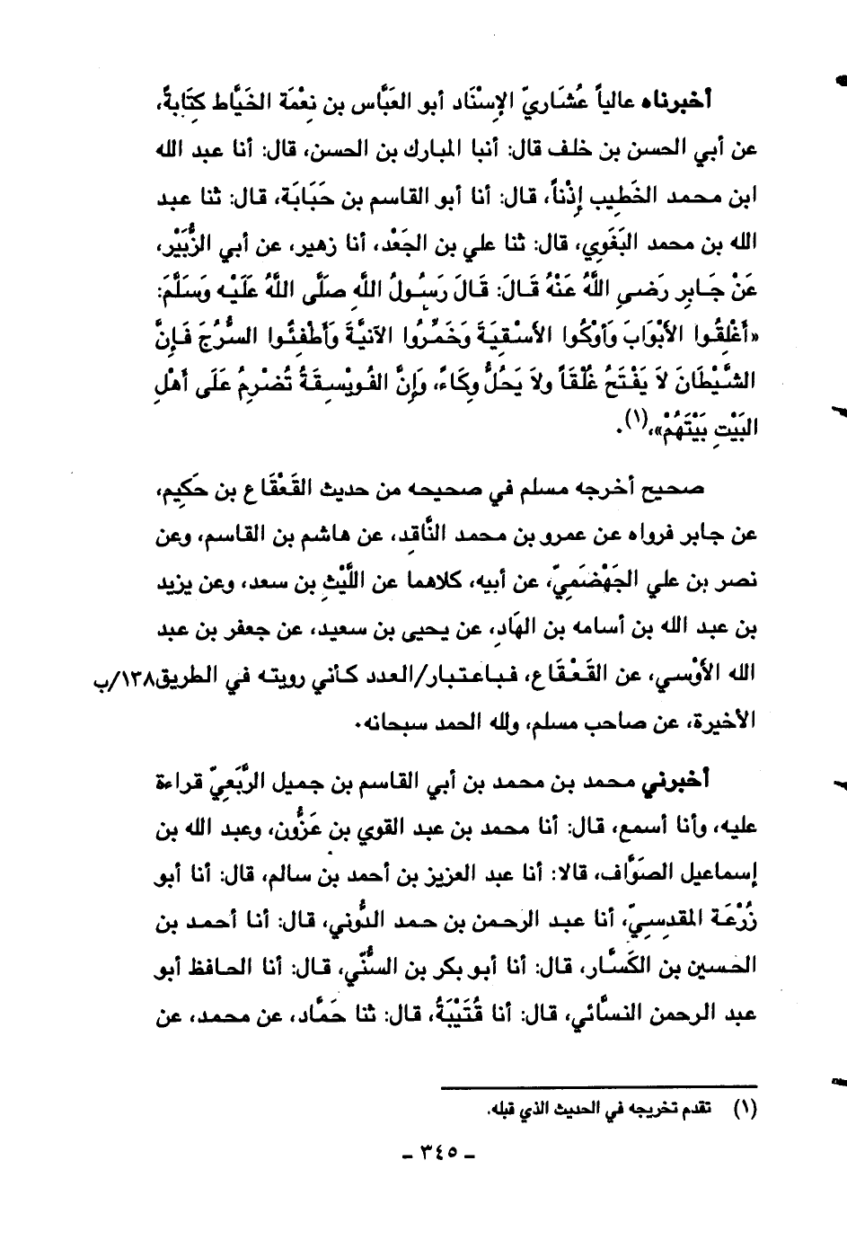 أخبرناه عالياً عشاري الإسناد أبو العباس بن نعمة الخياط كتابةً، عن أبي الحسن بن خلف قال: أنبا المبارك بن الحسن، قال: أنا عبد الله ابن محمد الخطيب إذناً، قال: أنا أبو القاسم بن حبابة، قال: ثنا عبد الله بن محمد البغوي، قال: ثنا علي بن الجعد، أنا زهير، عن أبي الزبير، عن جابر رضي الله عنه قال: قال رسول الله صلى الله عليه وسلم: ((أغلقوا الأبواب وأوكوا الأسقية وخمورا الآنية وأطفئوا السرج فإن الشيطان لا يفتح غلقاً ولا يحل وكاءً، وإن الفويسقة تضرم على أهل البيت بيتهم)) .