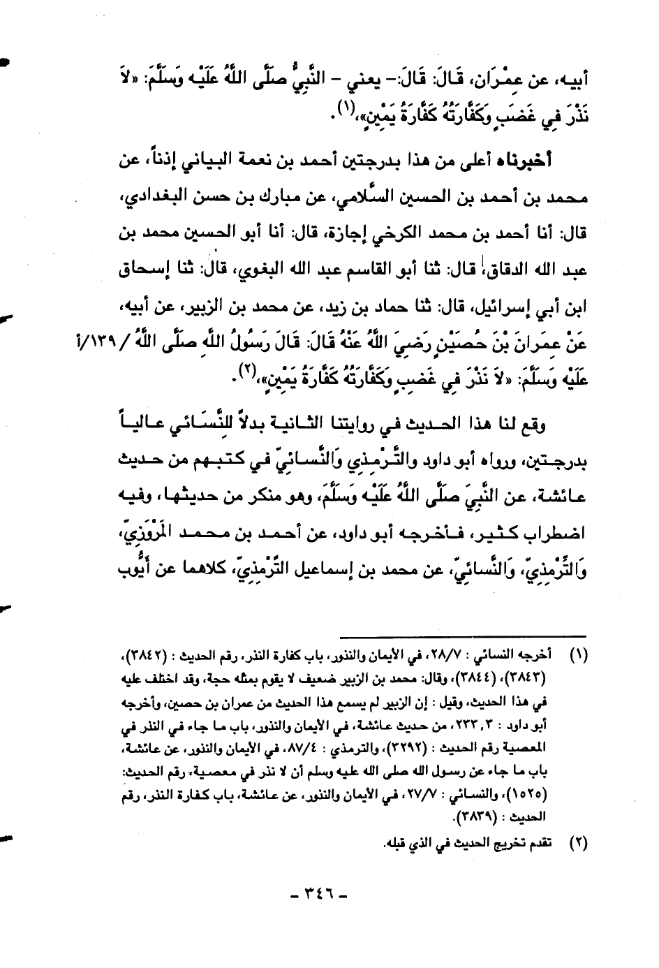 أخبرناه أعلى من هذا بدرجتين أحمد بن نعمة البياني إذناً، عن محمد بن أحمد بن الحسين السلامي، عن مبارك بن حسن البغدادي، قال: أنا أحمد بن محمد الكرخي إجازة، قال: أنا أبو الحسين محمد بن عبد الله الدقاق، قال: ثنا أبو القاسم عبد الله البغوي، قال: ثنا إسحاق ابن أبي إسرائيل، قال: ثنا حماد بن زيد، عن محمد بن الزبير، عن أبيه، عن عمران بن حصين رضي الله عنه قال: قال رسول الله صلى الله عليه وسلم: ((لا نذر في غضبٍ وكفارته كفارة يمينٍ)) .